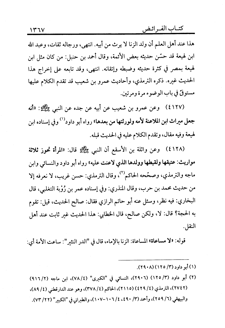 4127 - وعن عمرو بن شعيب عن أبيه عن جده عن النبي - صلى الله عليه وسلم -: «أنه جعل ميراث ابن الملاعنة لأمه ولورثتها من بعدها» رواه أبو داود (¬1) وفي إسناده ابن لهيعة وفيه مقال وتقدم الكلام عليه في الحديث قبله.