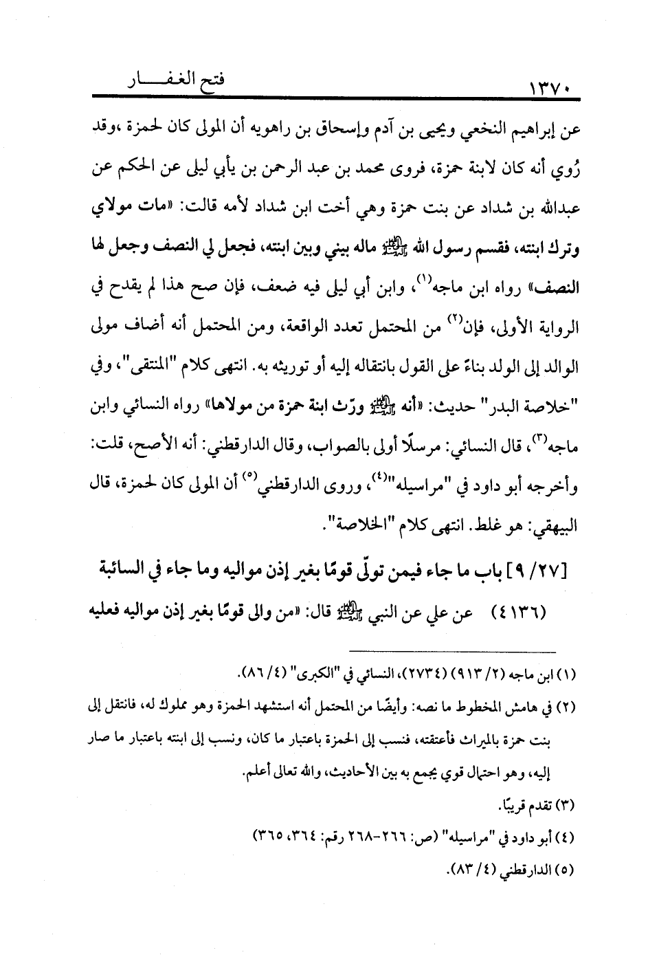 عن إبراهيم النخعي ويحيى بن آدم وإسحاق بن راهويه أن المولى كان لحمزة،وقد روي أنه كان لابنة حمزة فروى محمد بن عبد الرحمن بن أبي ليلى عن الحكم عن عبد الله بن شداد عن بنت حمزة وهي أخت ابن شداد لأمه قالت: «مات مولاي وترك ابنته، فقسم رسول الله - صلى الله عليه وسلم - ماله بيني وبين ابنته، فجعل لي النصف وجعل لها النصف» رواه ابن ماجه (¬1) وابن أبي ليلى فيه ضعف فإن صح هذا لم يقدح في الرواية الأولى فإن (¬2) من المحتمل تعدد الواقعه ومن المحتمل أنه أضاف مولى الوالد إلى الولد بناء على القول بانتقاله إليه أو توريثه به، انتهى كلام "المنتقى"، وفي "خلاصة البدر" حديث: «أنه - صلى الله عليه وسلم - ورث ابنة حمزة من مولاها» رواه النسائي وابن ماجه (¬3) . قال النسائي: مرسلًا أولى بالصواب، وقال الدارقطني: أنه الأصح، قلت: وأخرجه أبو داود في "مراسيله" (¬4) وروى الدارقطني (¬5) أن المولى كان لحمزة. قال البيهقي: هو غلط، انتهى كلام "الخلاصة".