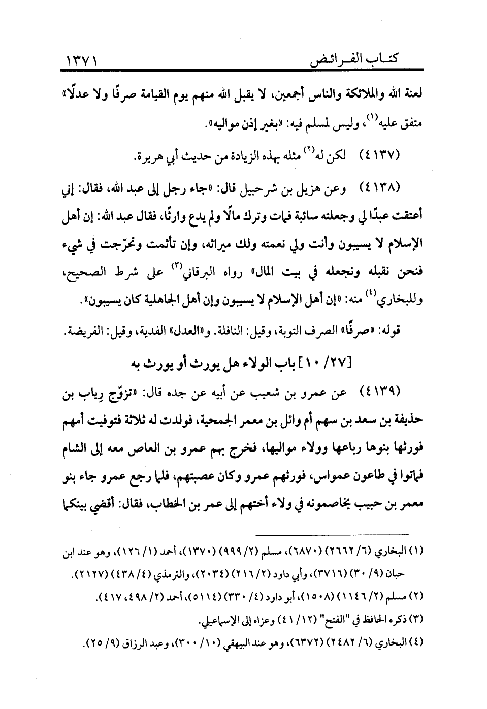 4138 - وعن هزيل بن شرحبيل قال: «جاء رجل إلى عبد الله، فقال: إني أعتقت عبدًا لي وجعلته سايبة فمات وترك مالًا ولم يدع وارثًا، فقال عبد الله: إن أهل الإسلام لا يسيبون وأنت ولي نعمته ولك ميراثه، وإن تأثمت وتحرجت في شيء فنحن نقبله ونجعله في بيت المال» رواه البرقاني (¬3) على شرط الصحيح، وللبخاري (¬4) منه: «إن أهل الإسلام لا يسيبون وإن أهل الجاهلية كان يسيبون» .