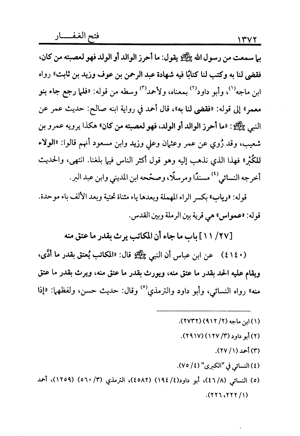 بما سمعت من رسول الله - صلى الله عليه وسلم - يقول: ما أحرز الوالد والولد فهو لعصبته من كان، فقضى لنا به وكتب لنا كتابًا فيه شهادة عبد الرحمن بن عوف وزيد بن ثابت» رواه ابن ماجه (¬1) وأبو داود (¬2) بمعناه ولأحمد (¬3) وسطه من قوله: «فلما رجع جاء بنو معمر إلى قوله: فقضى لنا به» قال أحمد في رواية ابنه صالح: حديث عمر عن النبي - صلى الله عليه وسلم -: «ما أحوز الوالد والولد، فهو لعصبته من كان» هكذا يرويه عمرو بن شعيب، وقد روي عن عمر وعثمان وعلي وزيد وابن مسعود أنهم قالوا: «الولاء للكبر» فهذا الذي نذهب إليه وهو قول أكثر الناس فيما بلغنا، انتهى. والحديث أخرجه النسائي (¬4) مسندًا ومرسلًا وصححه ابن المديني وابن عبد البر.