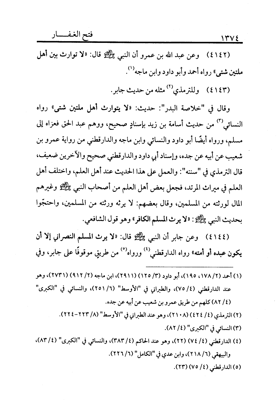 4142 - وعن عبد الله بن عمرو أن النبي - صلى الله عليه وسلم - قال: «لا توارث بين أهل ملتين شتى» رواه أحمد وأبو داود وابن ماجه (¬1) .