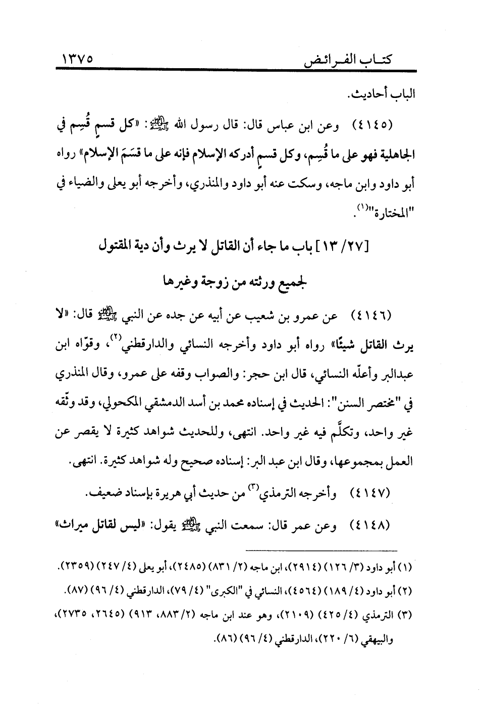 4146 - عن عمرو بن شعيب عن أبيه عن جده عن النبي - صلى الله عليه وسلم - قال: «لا يرث القاتل شيئًا» رواه أبو داود وأخرجه النسائي والدارقطني (¬2) ، وقواه ابن عبد البر وأعله النسائي، قال ابن حجر: والصواب وقفه على عمرو، وقال المنذري: في "مختصر السنن" الحديث في إسناده محمد بن أسد الدمشقي المكحولي، وقد وثقه غير واحد، وتكلم فيه غير واحد، انتهى. وللحديث شواهد كثيرة لا يقصر عن العمل بمجموعها، وقال ابن عبد البر: إسناده صحيح وله شواهد كثيرة، انتهى.