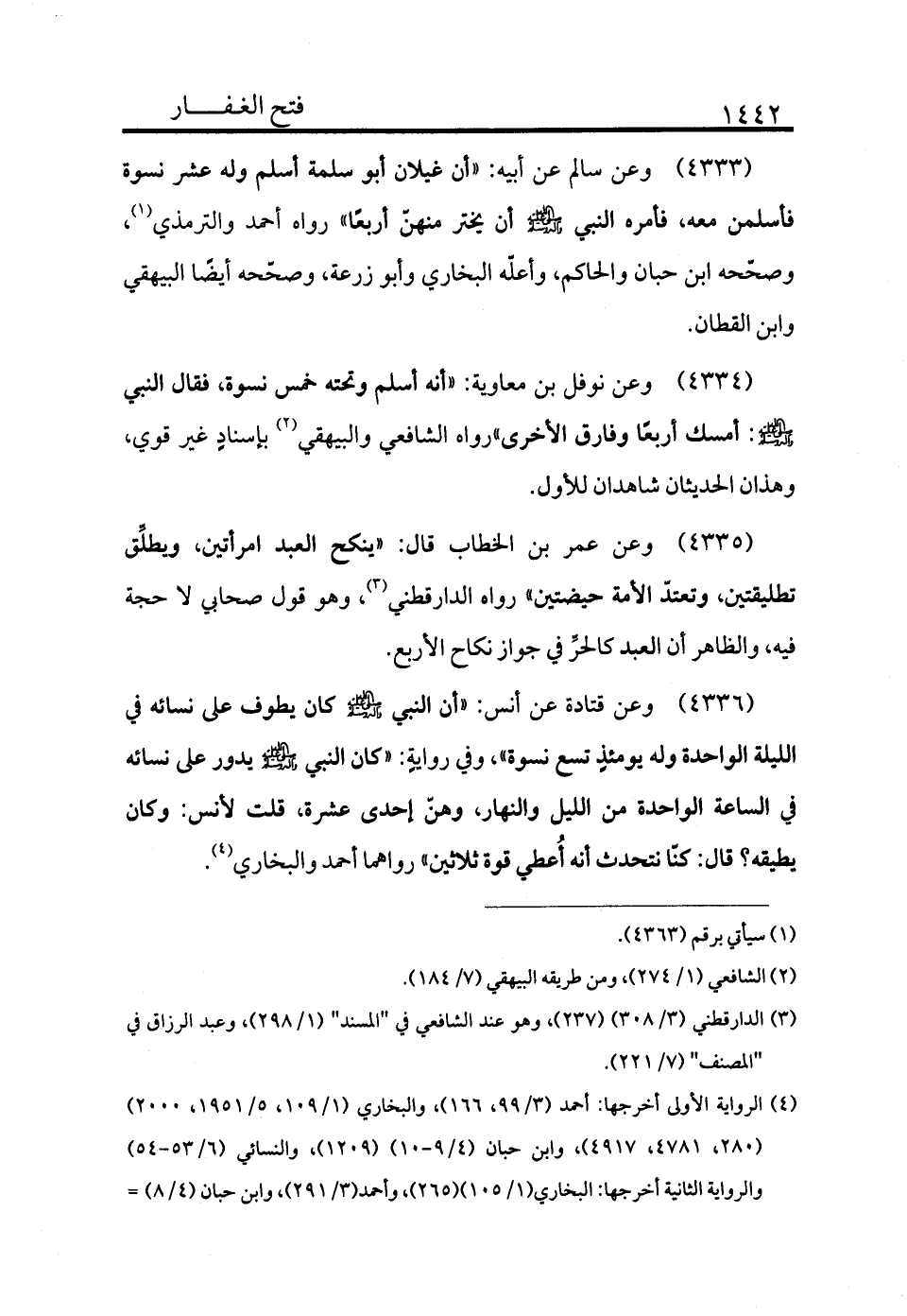 4335 - وعن عمر بن الخطاب قال: «ينكح العبد امرأتين ويطلق تطليقتين وتعتد الأمة حيضتين» رواه الدارقطني (¬3) وهو قول صحابي لا حجة فيه والظاهر أن العبد كالحر في جواز النكاح الأربع.