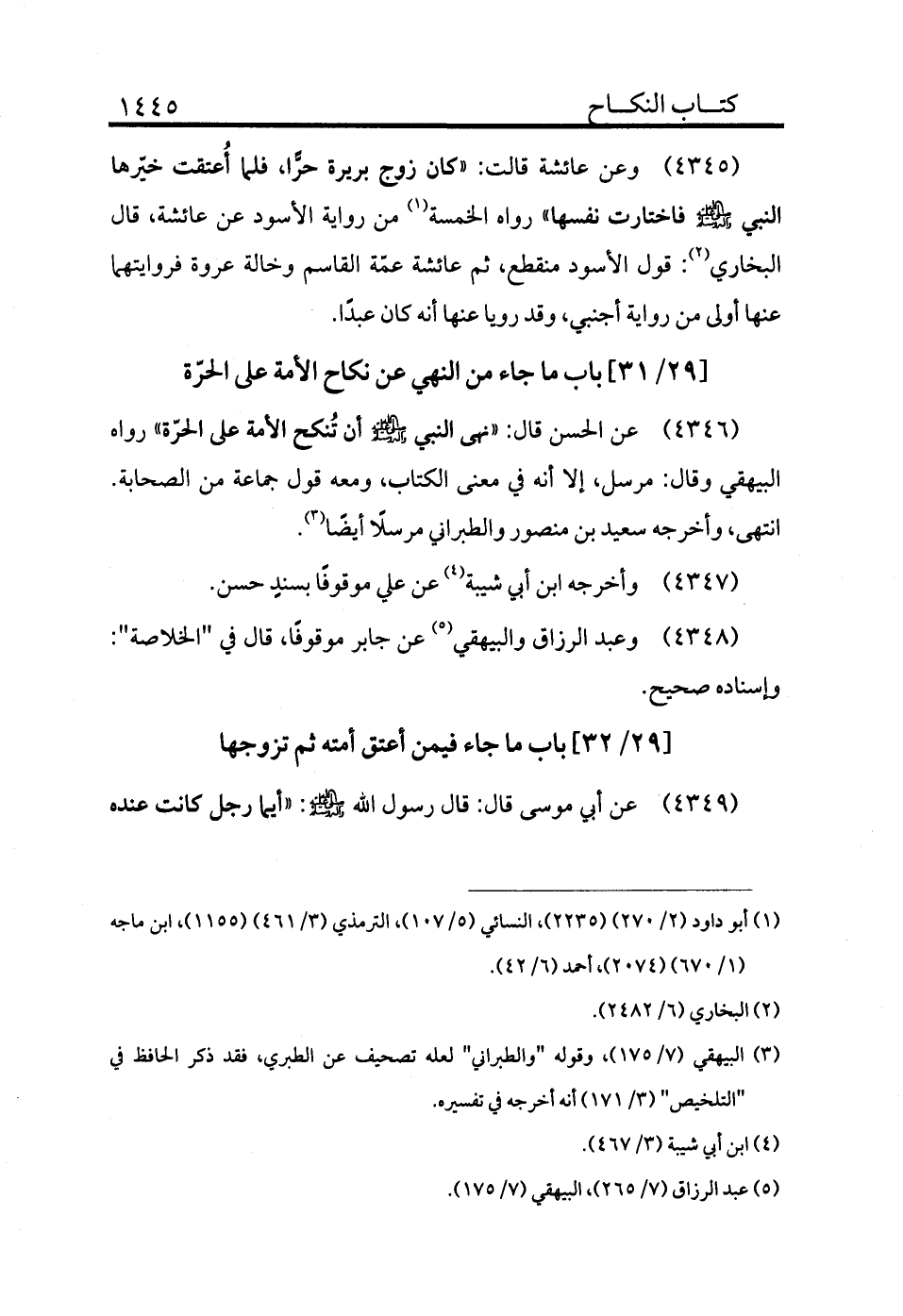 4345 - وعن عائشة قالت: «كان زوج بريرة حرًا فلما أعتقت خيرها النبي - صلى الله عليه وسلم - فاختارت نفسها» رواه الخمسة (¬1) من رواية الأسود عن عائشة، قال البخاري (¬2) : قول الأسود منقطع، ثم عائشة عمة القاسم وخالة عروة فروايتهما عنها أولى من رواته أجنبي، وقد روي عنها أنه كان عبدًا.