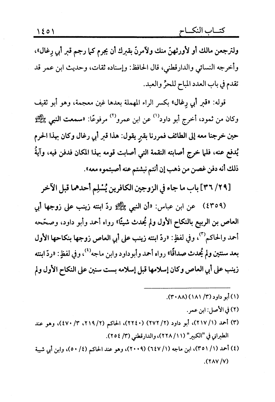 ولترجعن مالك أو لأورثهن منك ولآمرن بقبرك أن يجرم كما رجم قبر أبي رغال» وأخرجه النسائي والدارقطني، قال الحافظ: وإسناده ثقات، وحديث ابن عمر قد تقدم في باب العدد المباح للحر والعبد.