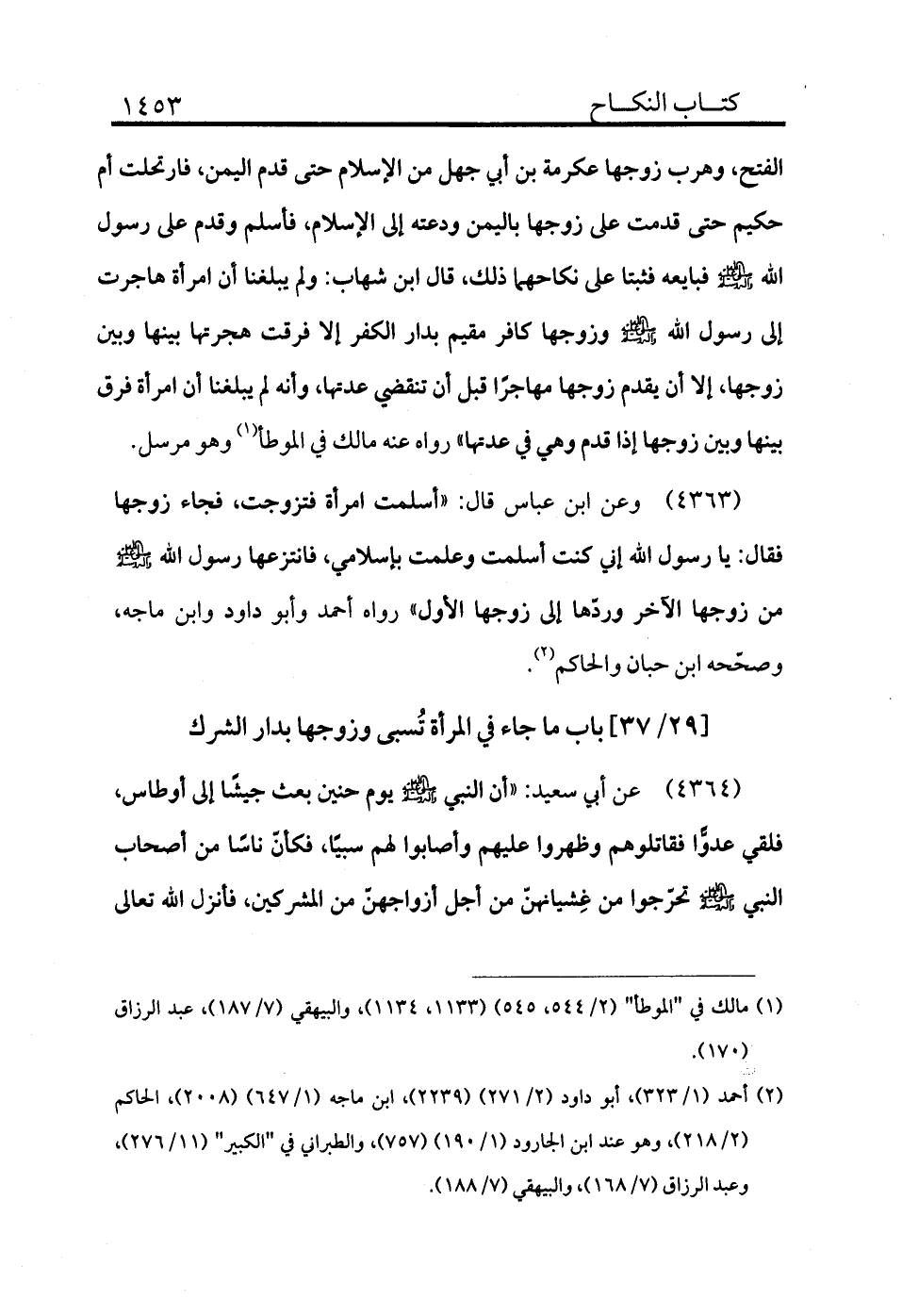 الفتح وهرب زوجها عكرمة بن أبي جهل حتى قدم اليمن فارتحلت أم حكيم حتى قدمت على زوجها باليمن ودعته إلى الإسلام فأسلم وقدم على رسول الله - صلى الله عليه وسلم - فبايعه فثبتا على نكاحهما ذلك، قال ابن شهاب: ولم يبلغنا أن امرأة هاجرت إلى رسول الله - صلى الله عليه وسلم - وزوجها كافر مقيم بدار الكفر إلا فرقت هجرتها بينها وبين زوجها إلا أن يقدم زوجها مهاجرًا قبل أن تنقضي عدتها وأنه لم يبلغنا أن امرأة فرق بينها وبين زوجها إذا قدم وهي في عدتها» رواه عنه مالك في الموطأ (¬1) وهو مرسل.