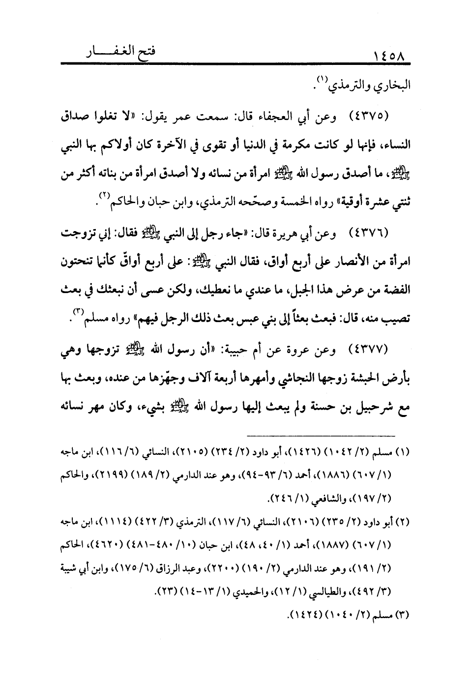 4375 - وعن أبي العجفي قال: سمعت عمر يقول: «لا تغلوا صداق النساء فإنها لو كانت مكرمة في الدنيا أو تقوى في الآخرة كان أولاكم بها النبي - صلى الله عليه وسلم - ما أصدق رسول الله - صلى الله عليه وسلم - امرأة من نسائه ولا أصدق امرأة من بناته أكثر من ثنتي عشرة أوقية» رواه الخمسة وصححه الترمذي وابن حبان والحاكم (¬2) .