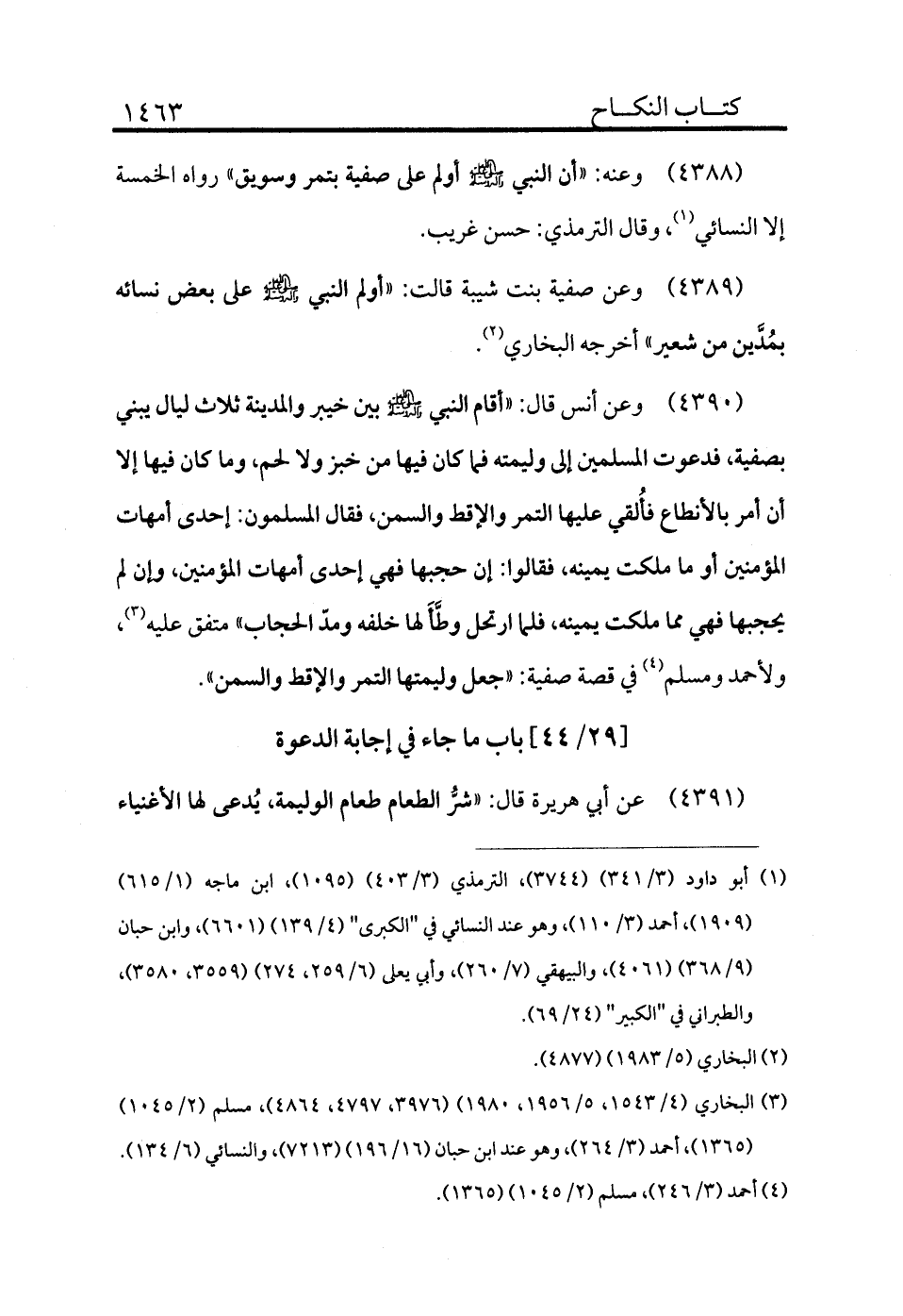 4388 - وعنه: «أن النبي - صلى الله عليه وسلم - أولم على صفية بتمر وسويق» رواه الخمسة إلا النسائي (¬1) ، وقال الترمذي: حسن غريب.