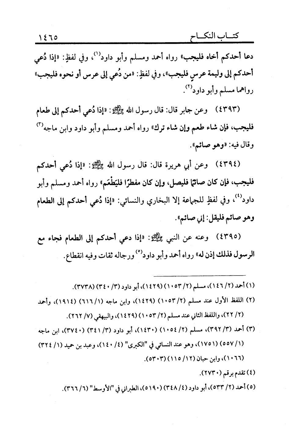 4393 - وعن جابر قال: قال رسول الله - صلى الله عليه وسلم -: «إذا دعي أحدكم إلى طعام فليجب، فإن شاء طعم وإن شاء ترك» رواه أحمد ومسلم وأبو داود وابن ماجه (¬3) وقال فيه: «وهو صائم» .