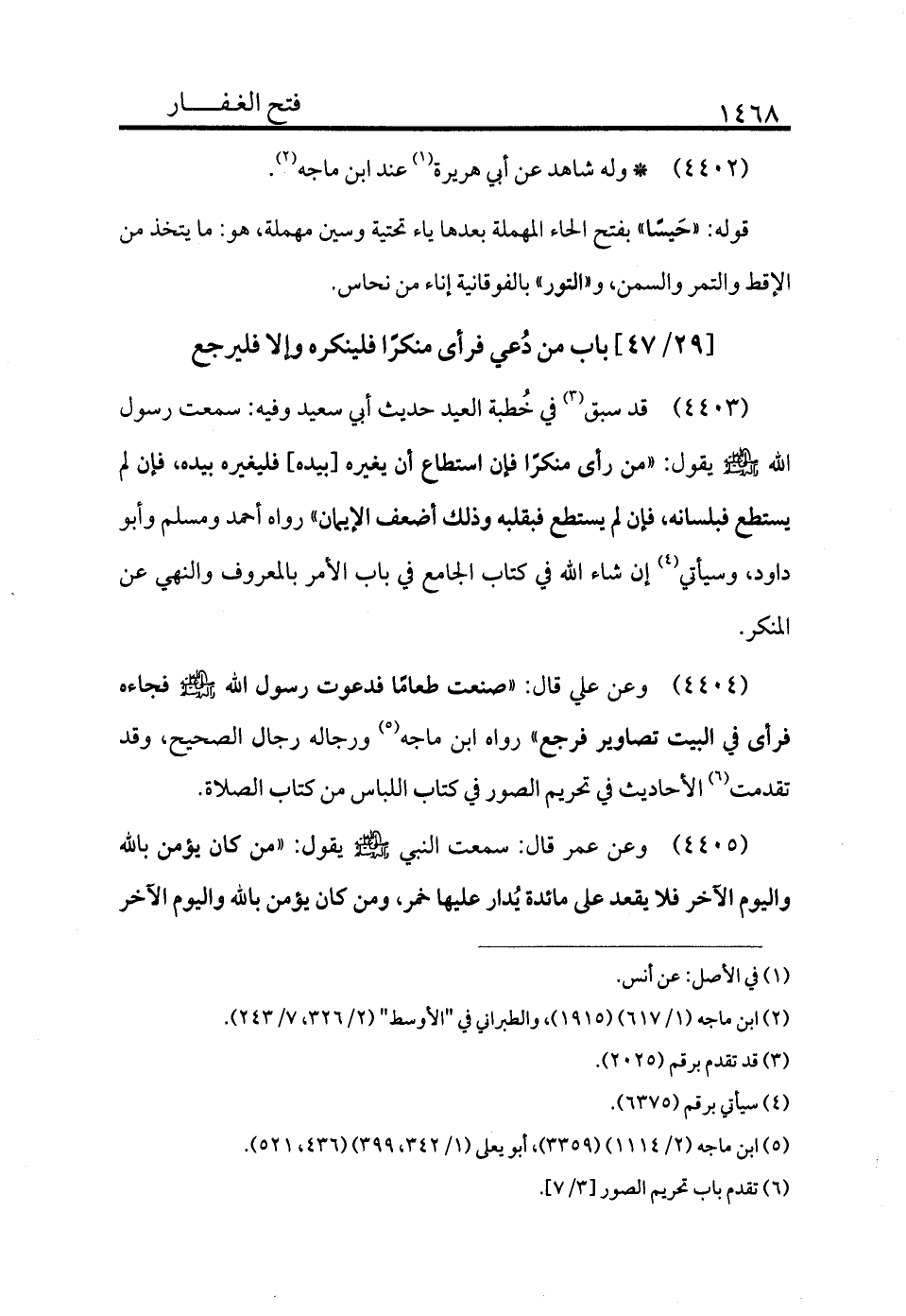 4403 - قد سبق (¬3) في خطبة العيد حديث أبي سعيد وفيه سمعت رسول الله - صلى الله عليه وسلم - يقول: «من رأى منكرًا فإن استطاع أن يغيره بيده فليغيره بيده، فإن لم يستطع فبلسانه، فإن لم يستطع فبقلبه، وذلك أضعف الإيمان» رواه أحمد ومسلم وأبو داود وسيأتي (¬4) إن شاء الله في كتاب الجامع في باب الأمر بالمعروف والنهي عن المنكر.