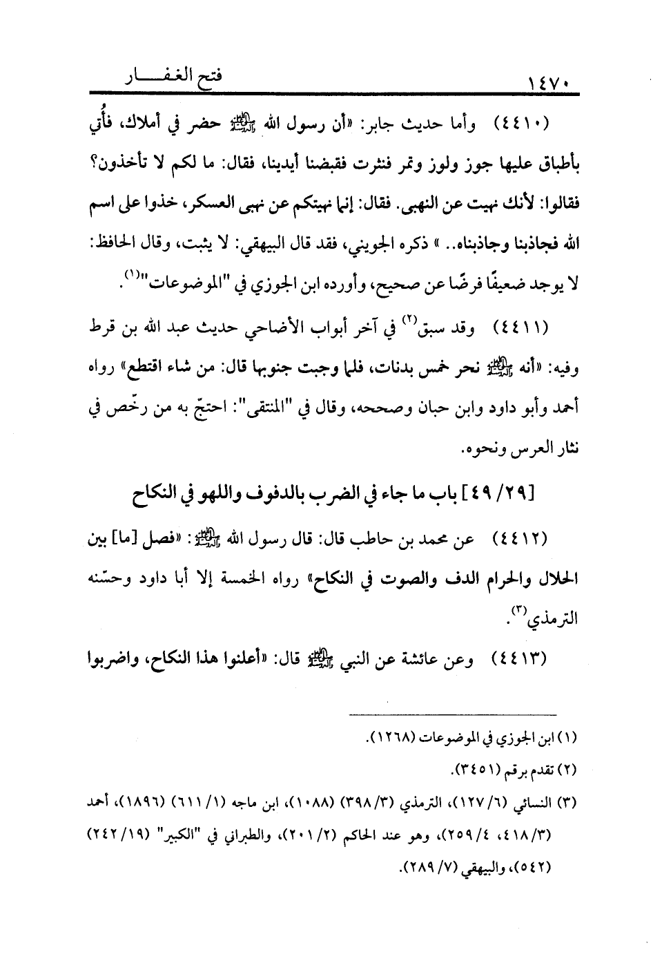 4412 - عن محمد بن حاطب قال: قال رسول الله - صلى الله عليه وسلم -: «فصل بين الحلال والحرام الدف والصوت في النكاح» رواه الخمسة إلا أبا داود وحسنه الترمذي (¬3) .
