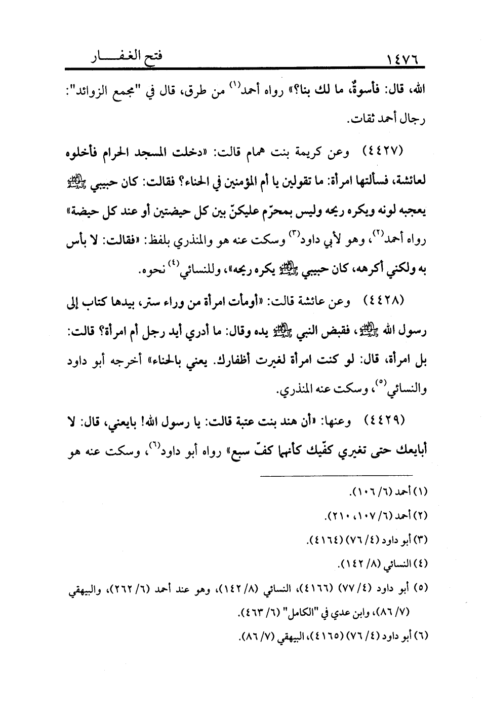 4428 - وعن عائشة قالت: «أومأت امرأة من وراء ستر بيدها كتاب إلى رسول الله - صلى الله عليه وسلم - فقبض النبي - صلى الله عليه وسلم - يده، وقال: ما أدري أيد رجل أم امرأة. قالت: بل امرأة، قال: لو كنت امرأة تغيرت أظفارك. يعني بالحناء» أخرجه أبو داود والنسائي (¬5) ، وسكت عنه المنذري.