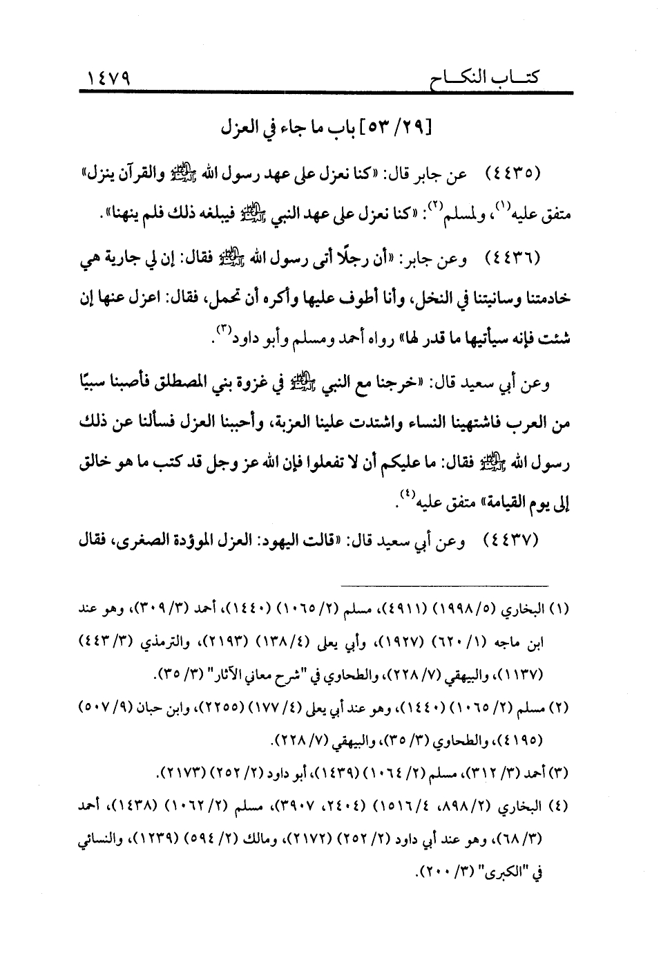 4435 - عن جابر قال: «كنا نعزل على عهد رسول الله - صلى الله عليه وسلم - والقرآن ينزل» متفق عليه (¬1) ، ولمسلم (¬2) : «كنا نعزل على عهد النبي - صلى الله عليه وسلم - فيبلغه ذلك فلم ينهنا»
