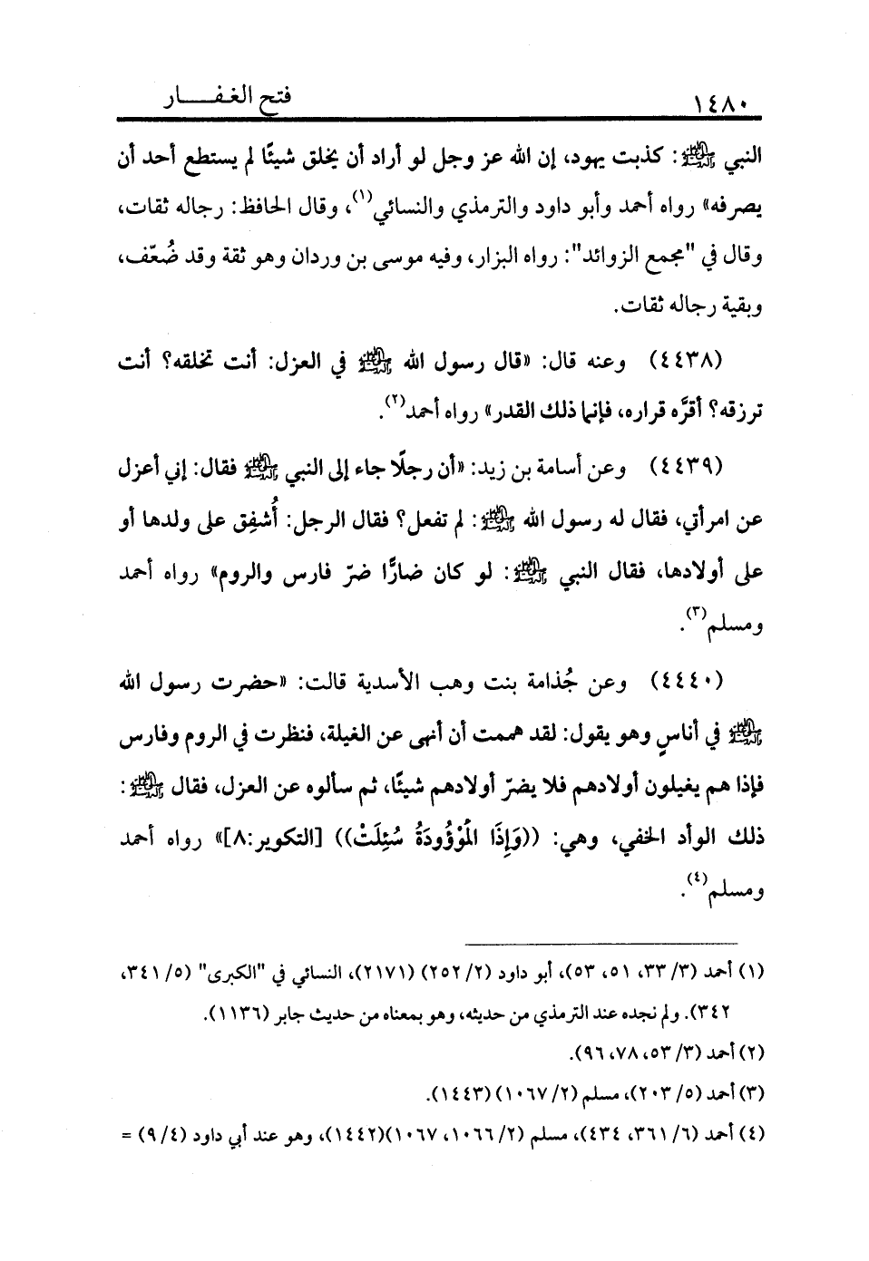 4439 - وعن أسامة بن زيد «أن رجلًا جاء إلى النبي - صلى الله عليه وسلم - فقال: إني أعزل عن امرأتي. فقال له رسول الله - صلى الله عليه وسلم -: لم تفعل؟ فقال الرجل: أشفق على ولدها أو على أولادها. فقال النبي - صلى الله عليه وسلم -: لو كان ضارًا لضر فارس والروم» رواه أحمد ومسلم (¬3) .