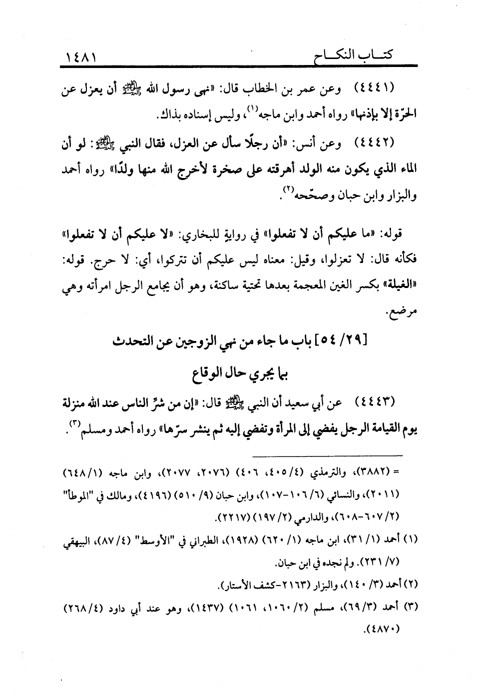 4441 - وعن عمر بن الخطاب قال: «نهى رسول الله - صلى الله عليه وسلم - أن يعزل عن الحرة إلا بإذنها» رواه أحمد وابن ماجة (¬1) وليس إسناده بذلك.