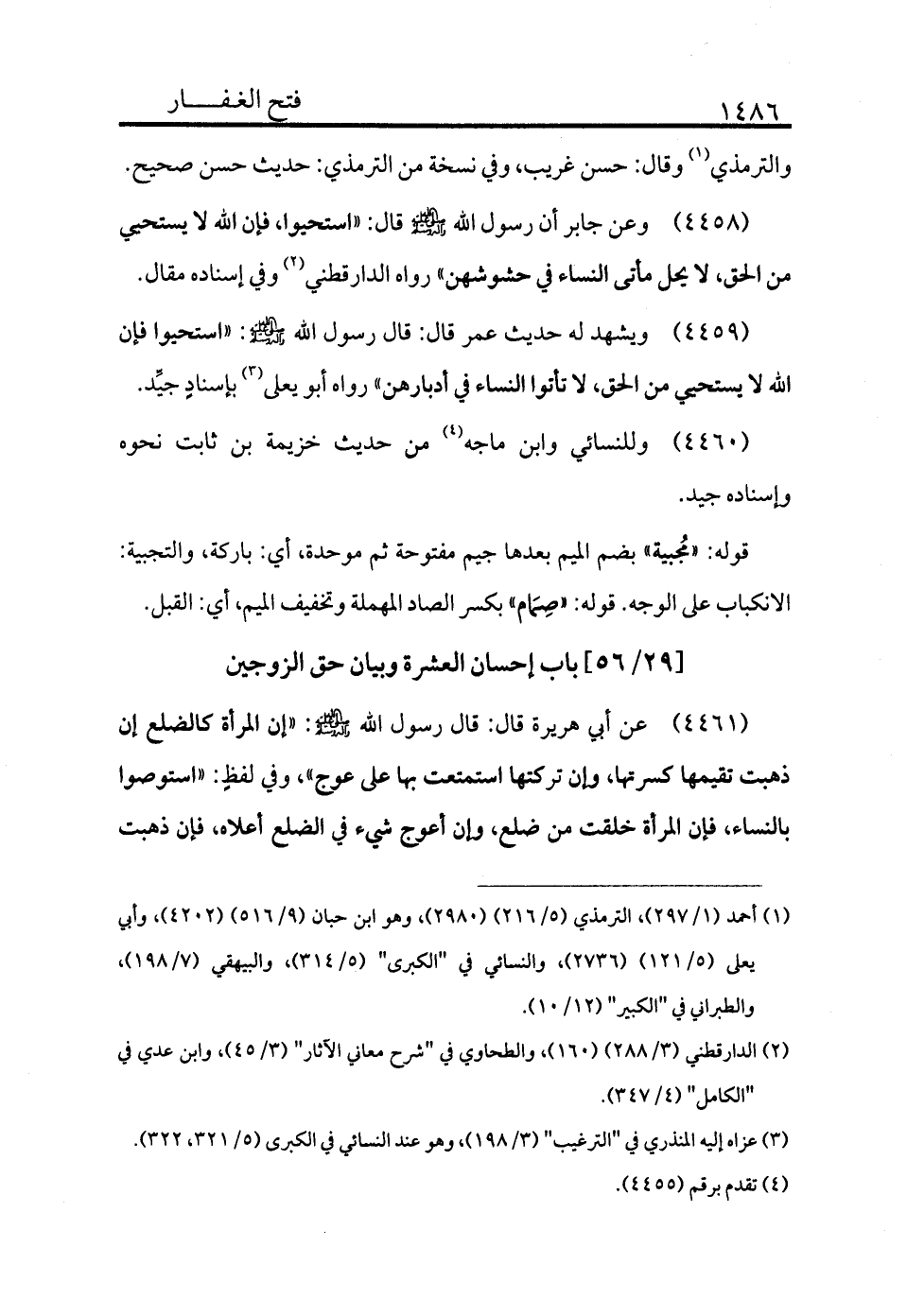 4459 - وعن جابر أن رسول الله - صلى الله عليه وسلم - قال: «استحيوا فإن الله لا يستحيي من الحق، لا يحل مأتى النساء في حشوشهن» رواه الدارقطني (¬2) وفي إسناده مقال.