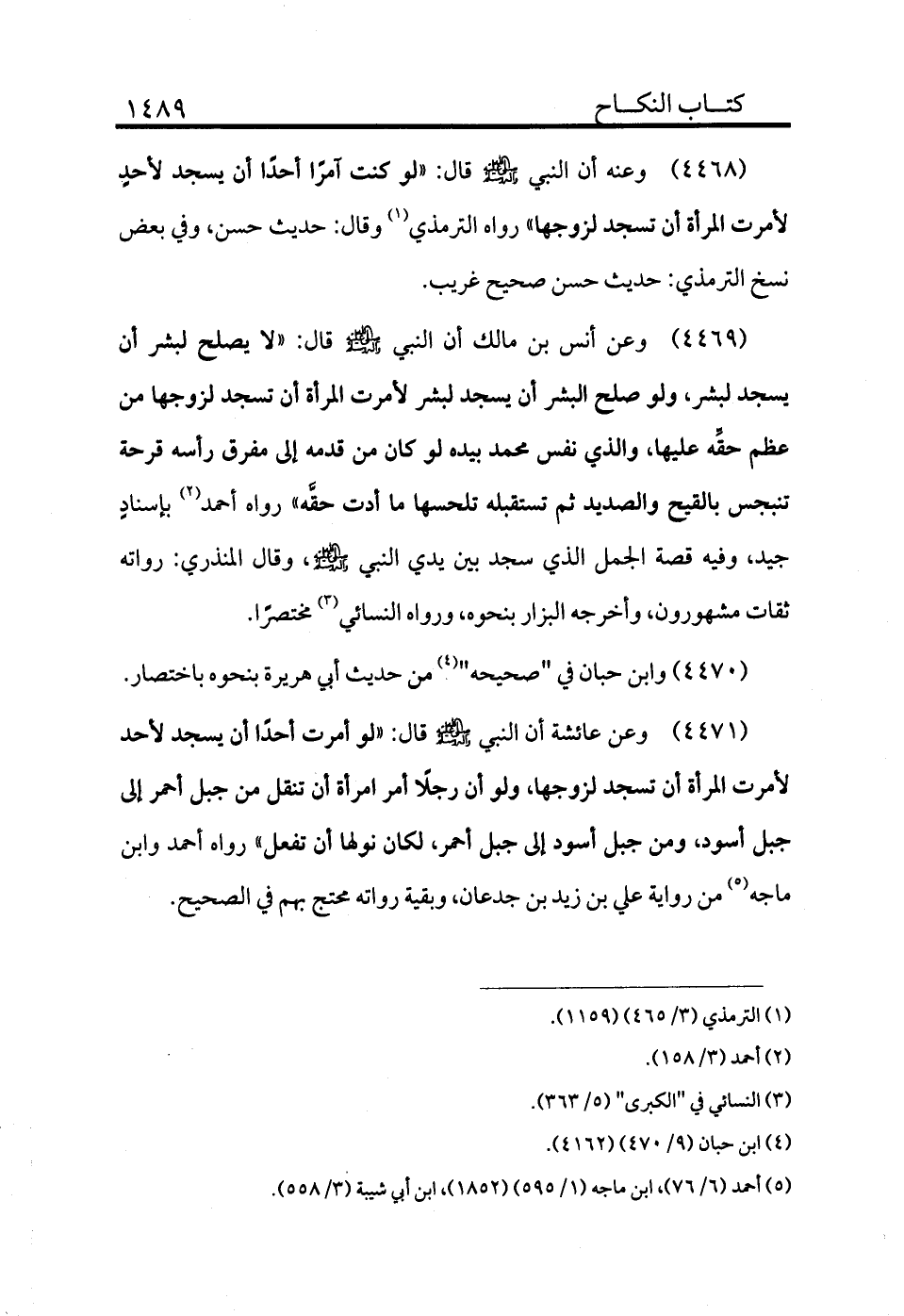 4470 - وعن أنس بن مالك أن النبي - صلى الله عليه وسلم - قال: «لا يصلح لبشر أن يسجد لبشر، ولو صلح البشر أن يسجد لبشر لأمرت المرأة أن تسجد لزوجها من عظم حقه عليها، والذي نفس محمد بيده لو كان من قدمه إلى مفرق رأسه قرحة تنبجس بالقيح والصديد ثم تستقبله تلحسها ما أدت حقه» رواه أحمد (¬2) بإسناد جيد، وفيه قصة الجمل الذي سجد بين يدي النبي - صلى الله عليه وسلم -، وقال المنذري: رواته ثقات مشهورون، وأخرجه البزار بنحوه. ورواه النسائي (¬3) مختصرًا.