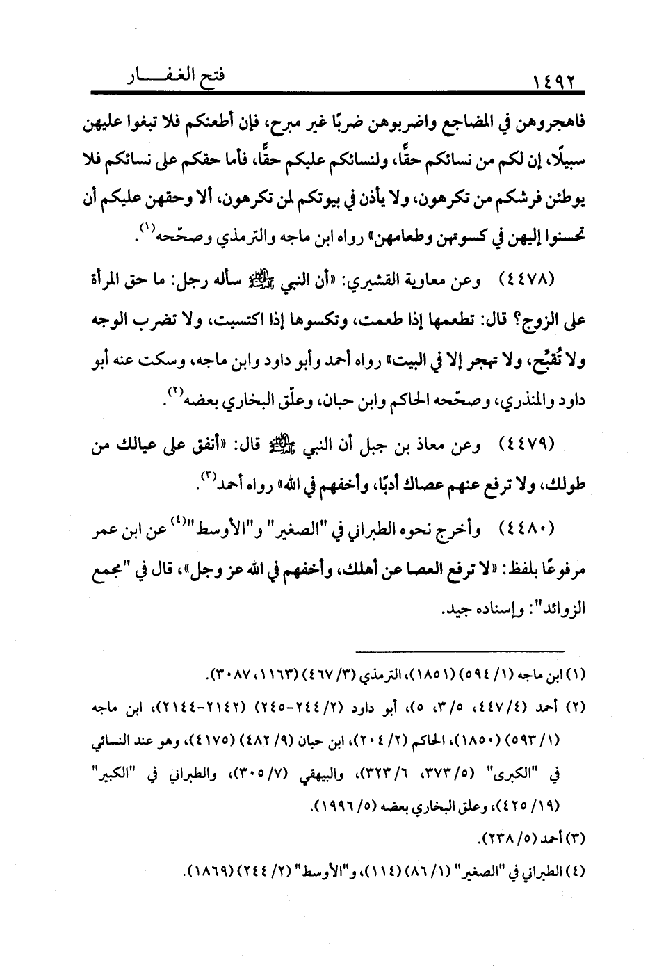 4479 - وعن معاوية القشيري «أن النبي - صلى الله عليه وسلم - سأله رجل: ما حق المرأة على الزوج؟ قال: تطعمها إذا طعمت، وتكسوها إذا اكتسيت، ولا تضرب الوجه، ولا تقبح، ولا تهجر إلا في البيت» رواه أحمد وأبو داود وابن ماجة، وسكت عنه أبو داود والمنذري، وصححه الحاكم وابن حبان، وعلق البخاري بعضه (¬2) .