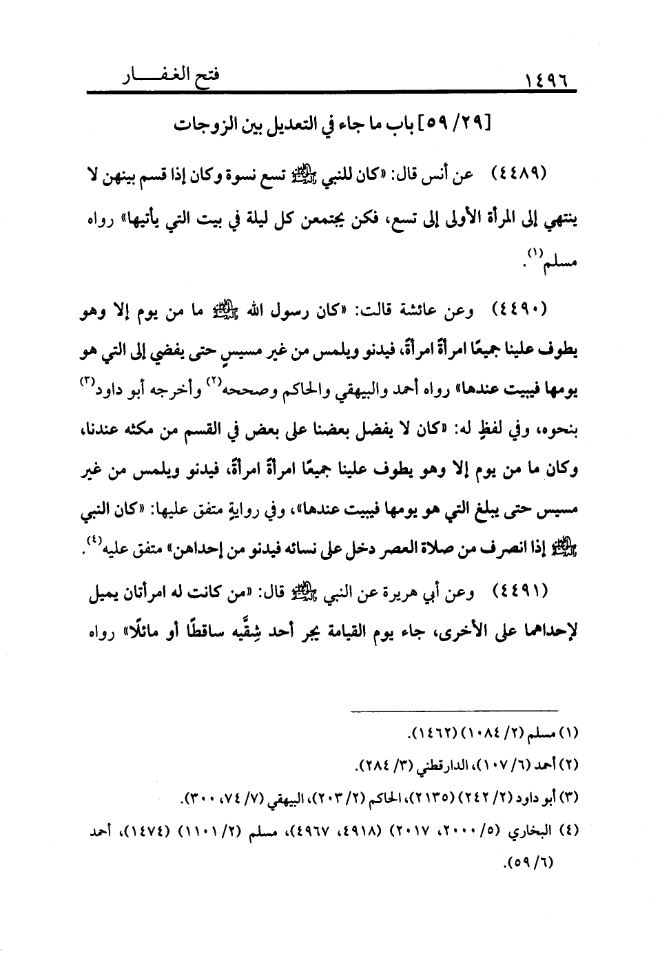 4490 - عن أنس قال: «كان للنبي - صلى الله عليه وسلم - تسع نسوة وكان إذا قسم بينهن لا ينتهي إلى المرأة الأولى إلى تسع فكن يجتمعن كل ليلة في بيت التي يأتيها» رواه مسلم (¬1) .