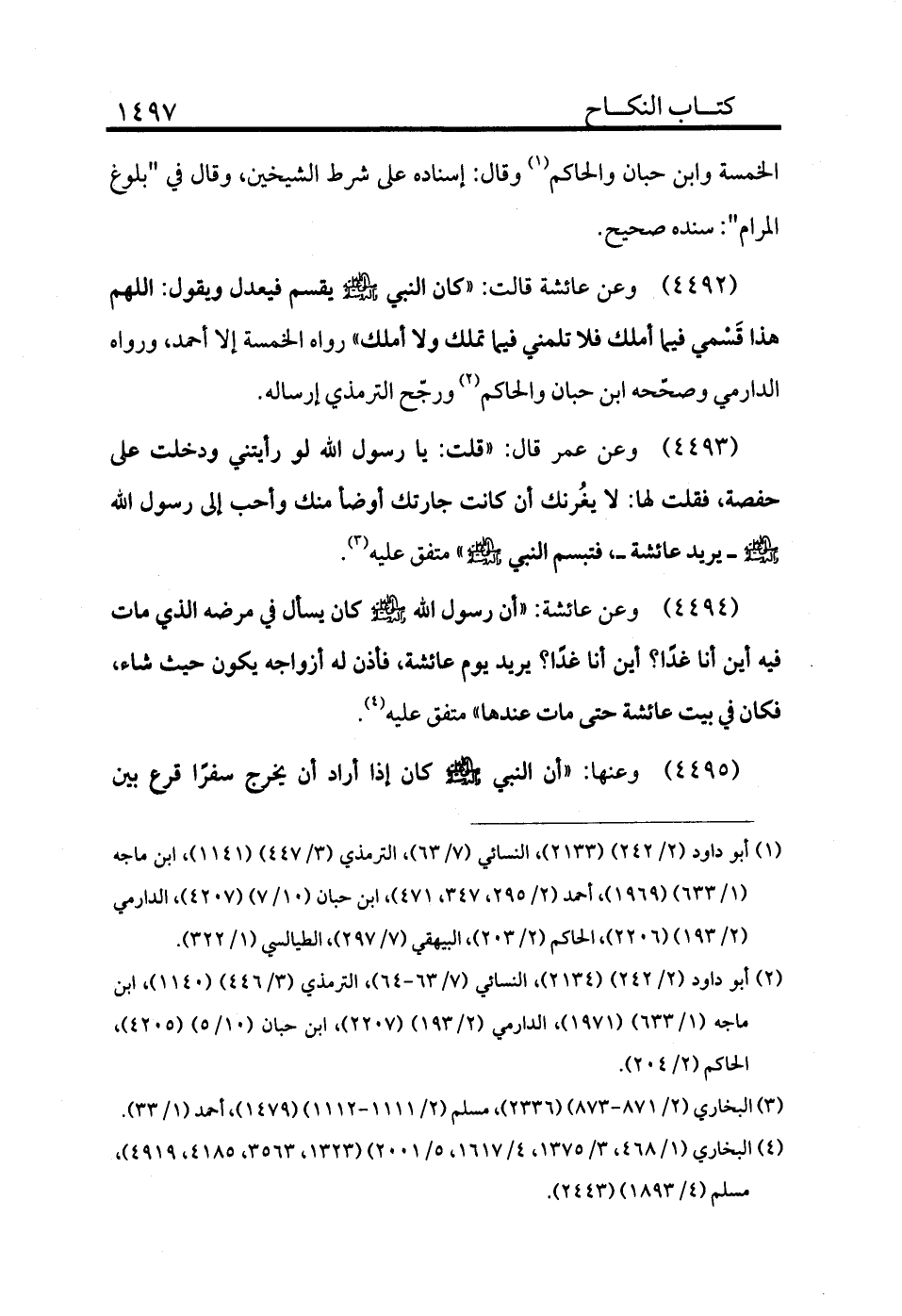 4493 - وعن عائشة قالت: «كان النبي - صلى الله عليه وسلم - يقسم فيعدل ويقول: اللهم هذا قسمي فيما أملك فلا تلمني فيما تملك ولا أملك» رواه الخمسة إلا أحمد ورواه الدارمي وصححه ابن حبان والحاكم (¬2) ورجح الترمذي ارساله.