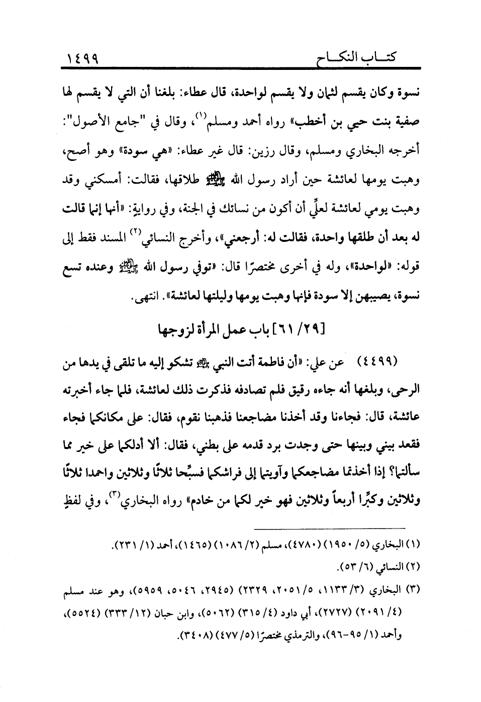 4500 - عن علي رضي الله عنه: «أن فاطمة أتت النبي - صلى الله عليه وسلم - تشكو إليه ما تلقى في يدها من الرحى، وبلغها أنه جاءه رقيق فلم تصادفه، فذكرت لعائشة، فلما جاء أخبرته عائشة، قال: فجاءنا وقد أخذنا مضاجعنا فذهبنا نقوم، فقال: على مكانكما فجاء فقعد بيني وبينها حتى وجدت برد قدمه على بطني، فقال: ألا أدلكما على خير مما سألتما؟ إذا أخذتما مضاجعكما وآويتما إلى فراشكما فسبحا ثلاثًا وثلاثين واحمدا ثلاثًا وثلاثين وكبرا أربعاً وثلاثين فهو خير لكما من خادم» رواه البخاري (¬3) ، وفي لفظ