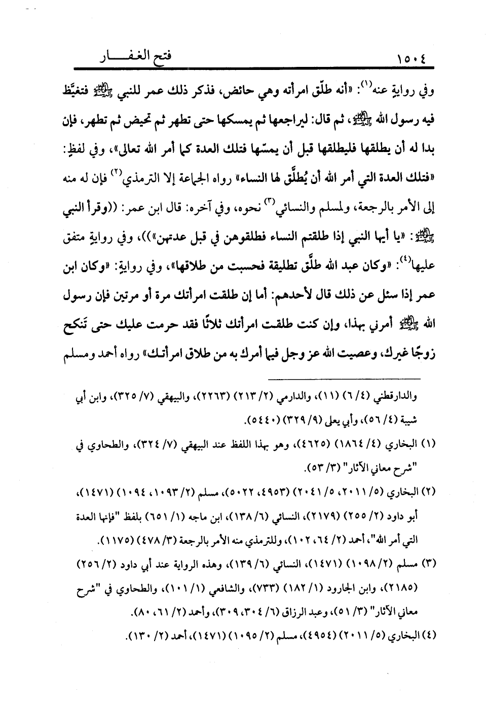 (¬2) البخاري (5/2011، 5/2041) (4953، 5022) ، مسلم (2/1093، 1094) (1471) ، أبو داود (2/255) (2179) ، النسائي (6/138) ، ابن ماجه (1/651) بلفظ "فإنها العدة التي أمر الله"، أحمد (2/64، 102) ، وللترمذي منه الأمر بالرجعة (3/478) (1175) .