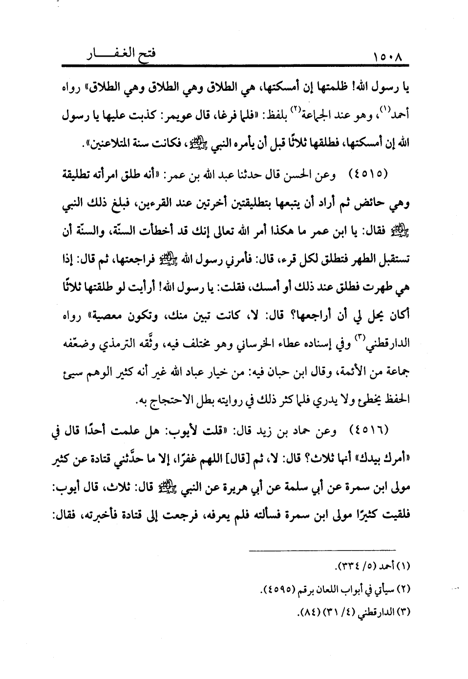 4517 - وعن حماد بن زيد قال: «قلت لأيوب: هل علمت أحدًا قال في أمرك بيدك وأنها ثلاث، قال: لا ثم اللهم غفرا إلا ما حدثني قتادة عن كبير مولى ابن سمرة عن أبي سلمة عن أبي هريرة عن النبي - صلى الله عليه وسلم - قال: ثلاث، قال أيوب فلقيت كبيرًا مولى ابن سمرة مسألته فلم يعرفه فرجعت إلى قتادة فأخبرته فقال: