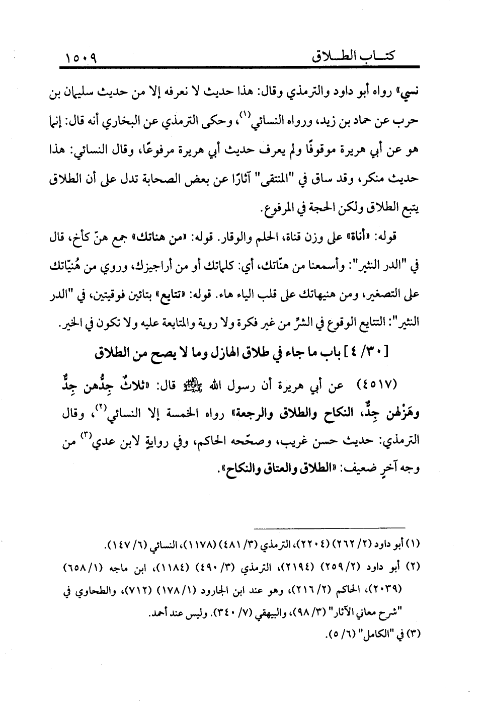 4518 - عن أبي هريرة أن رسول الله - صلى الله عليه وسلم - قال: «ثلاث جدهن جد وهزلهن جد، النكاح والطلاق والرجعة» رواه الخمسة إلا النسائي (¬2) وقال الترمذي: حديث حسن غريب وصححه الحاكم، وفي رواية لابن عدي (¬3) من وجه آخر ضعيف: «الطلاق والعتاق والنكاح»