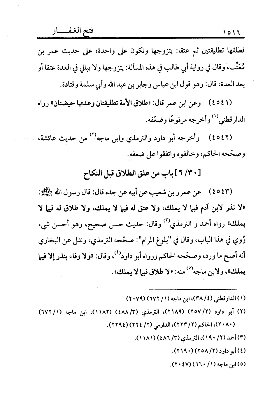 4544 - عن عمرو بن شعيب عن أبيه عن جده قال: «قال رسول الله - صلى الله عليه وسلم -: لا نذر لابن آدم في ما لا يملك ولا عتق له فيما لا يملك ولا طلاق له فيما لا يملك» رواه أحمد والترمذي (¬3) وقال: حديث حسن صحيح، وهو أحسن شيء روي في هذا الباب وقال في "بلوغ المرام": صححه الترمذي، ونقل عن البخاري أنه أصح ما ورد، وصححه الحاكم ورواه أبو داود (¬4) ، قال: «ولا وفاء بنذر إلا فيما يملك» ولابن ماجة (¬5) منه: «لا طلاق فيما لا يملك»