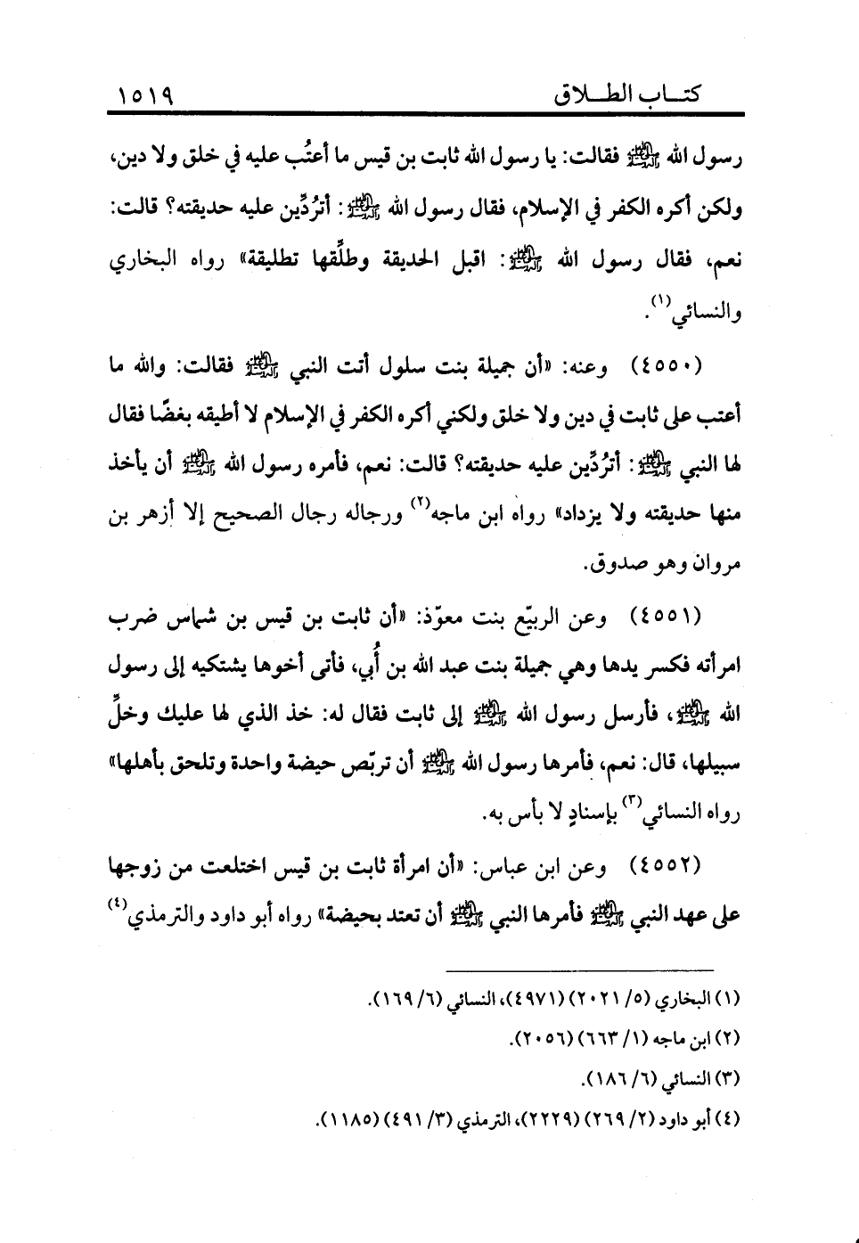 4552 - وعن الربيع بنت معوذ «أن ثابت بن قيس بن شماس ضرب امرأته فكسر يدها وهي جميلة بنت عبد الله بن أبي فأتى أخوها يشتكيه إلى رسول الله - صلى الله عليه وسلم - فأرسل رسول الله - صلى الله عليه وسلم - إلى ثابت فقال له: خذ الذي لها عليك وخل سبيلها، قال: نعم، فأمرها رسول الله - صلى الله عليه وسلم - أن تربص حيضة واحدة وتلحق بأهلها» رواه النسائي (¬3) بإسنادٍ لا بأس به.