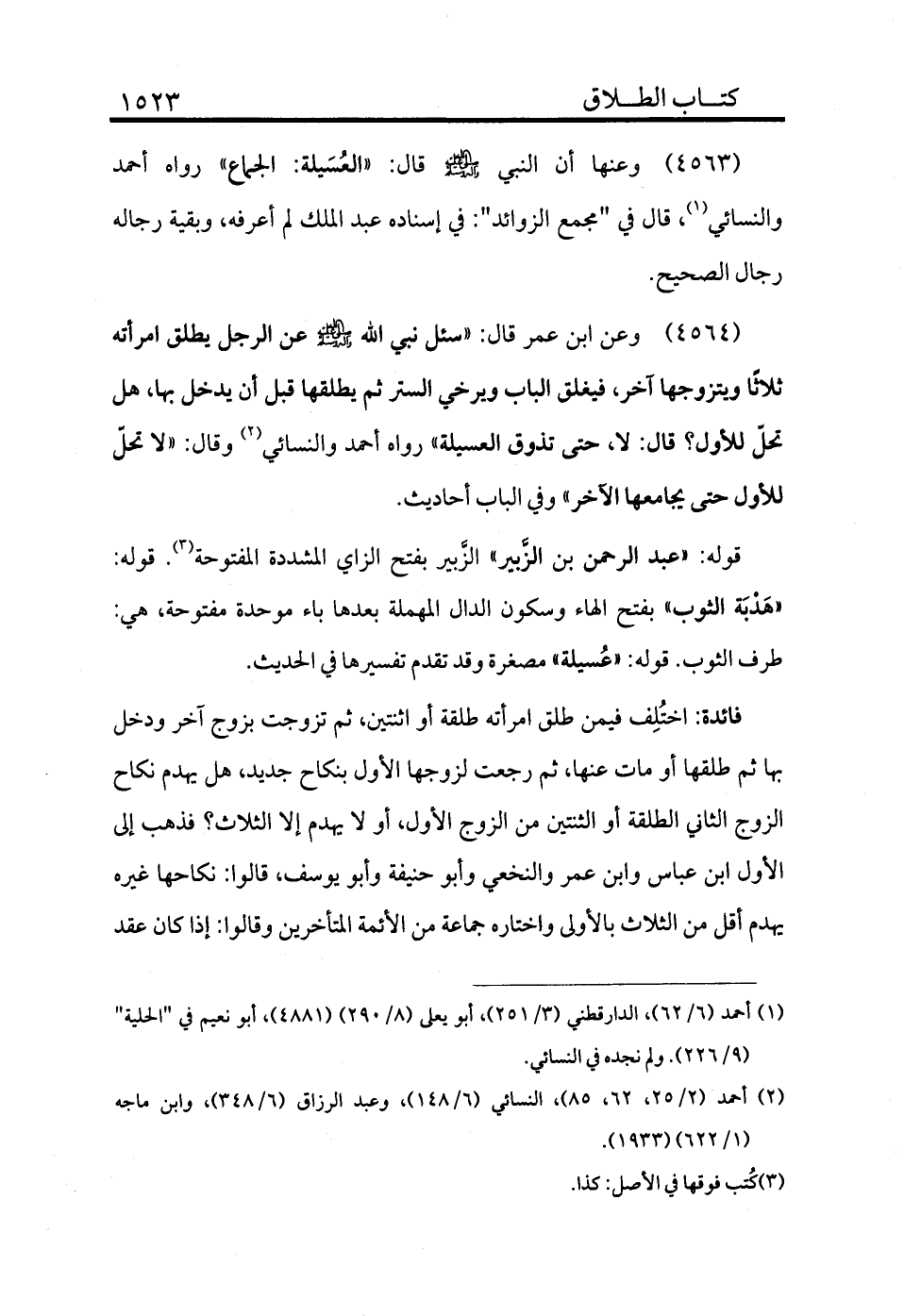 4565 - وعن ابن عمر قال: «سئل نبي الله - صلى الله عليه وسلم - عن الرجل يطلق امرأته ثلاثًا ويتزوجها آخر فيغلق الباب ويرخي الستر ثم يطلقها قبل أن يدخل بها هل تحل للأول؟ قال: لا حتى تذوق العسيلة» رواه أحمد والنسائي (¬2) وقال: «لا تحل للأول حتى يجامعها الآخر» وفي الباب أحاديث.