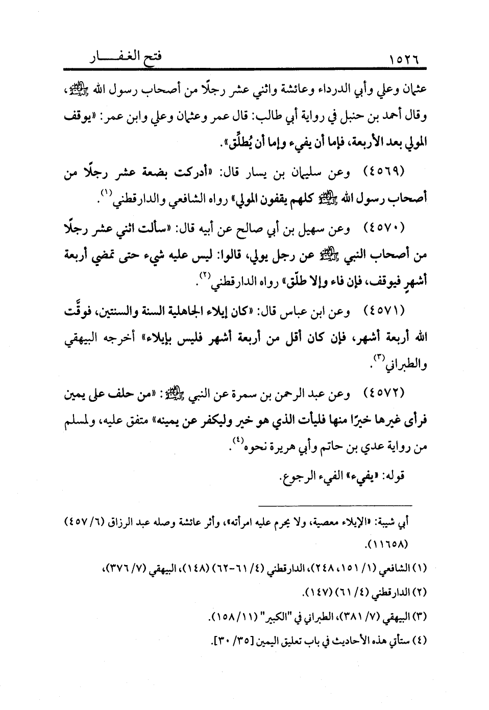 4571 - وعن سهيل بن أبي صالح عن أبيه قال: «سألت اثني عشر رجلًا من أصحاب النبي - صلى الله عليه وسلم - عن رجل يولي قالوا: ليس عليه شيء حتى يمضي أربعة أشهرٍ فيوقف فإن فاء وإلا طلق» رواه الدارقطني (¬2) .