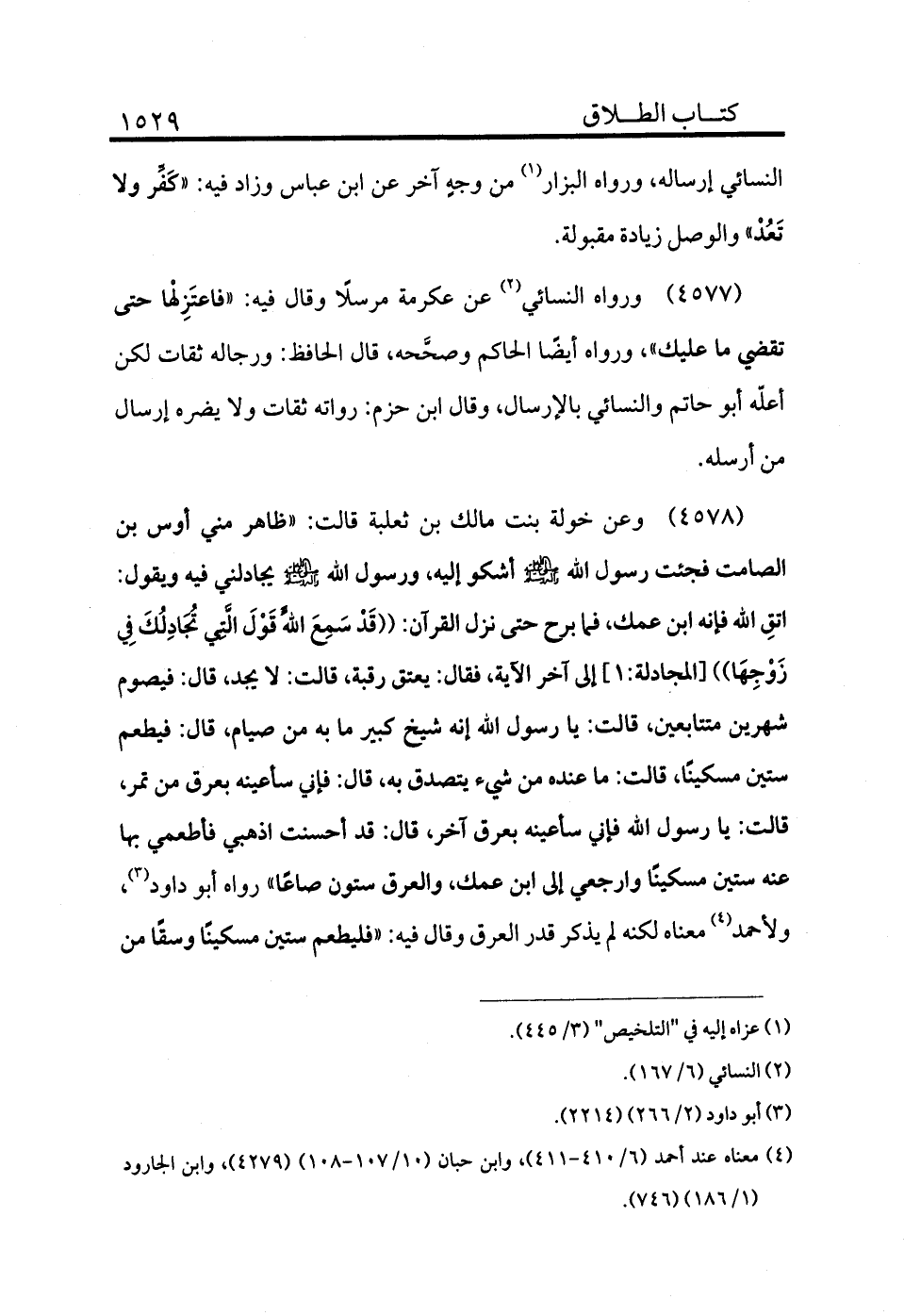 4579 - وعن خولة بنت مالك بن ثعلبة قالت: «ظاهر مني أوس بن الصامت فجئت رسول الله عليه وآله أفضل الصلاة والتسليم أشكو إليه ورسول الله يجادلني فيه ويقول: اتقِ الله فإنه ابن عمك فما برح حتى نزل القرآن ((قَدْ سَمِعَ اللَّهُ قَوْلَ الَّتِي تُجَادِلُكَ فِي زَوْجِهَا)) [المجادلة:1] الآية فقال: يعتق رقبة، قالت: لا يجد، قال: فيصوم شهرين متتابعين، قالت: يا رسول الله إنه شيخ كبير ما به من صيام، قال: فيطعم ستين مسكينًا، قالت: ما عنده من شيء يتصدق به، قال: فإني سأعينه بعرق من تمر، قالت: يا رسول الله فإني سأعينه بعرق آخر قال: قد أحسنت اذهبي فأطعمي بها عنه ستين مسكينًا وارجعي إلى ابن عمك والعرق ستون صاعًا» رواه أبو داود (¬3) ولأحمد (¬4) معناه لكنه لم يذكر قدر العرق وقال فيه: «فليطعم ستين مسكينًا وسقًا من