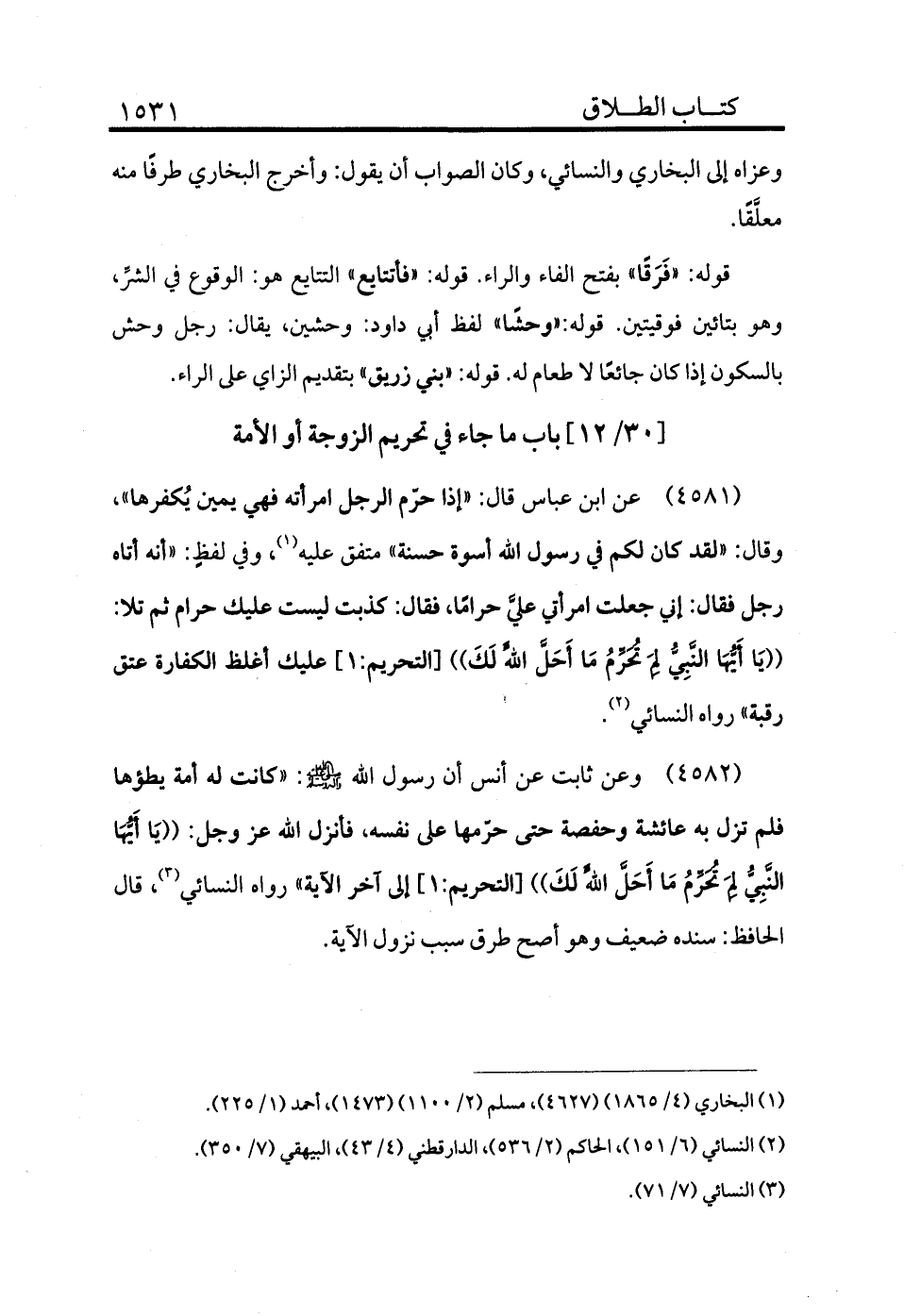 4583 - وعن ثابت عن أنس أن رسول الله - صلى الله عليه وسلم -: «كانت له أمة يطأها فلم تزل به عائشة وحفصة حتى حرمها على نفسه، فأنزل الله عز وجل: ((يَا أَيُّهَا النَّبِيُّ لِمَ تُحَرِّمُ مَا أَحَلَّ اللَّهُ لَكَ)) [التحريم:1] إلى آخر الآية» رواه النسائي (¬3) ، قال الحافظ: سنده ضعيف وهو أصح طرق سبب نزول الآية.