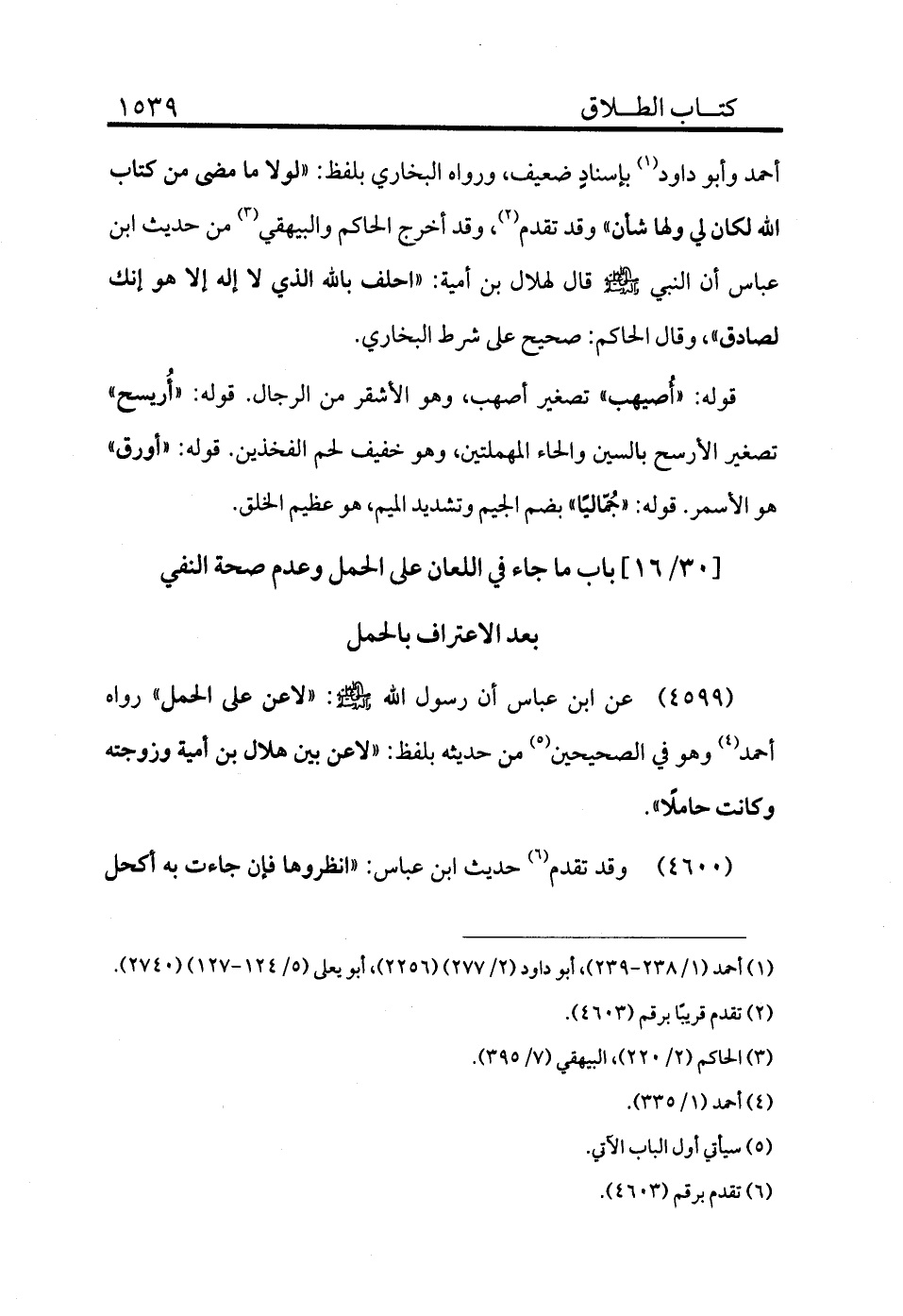 4600 - عن ابن عباس أن رسول الله - صلى الله عليه وسلم -: «لاعن على الحمل» رواه أحمد (¬4) وهو في الصحيحين (¬5) من حديثه بلفظ: «لاعن بين هلال بن أمية وزوجته وكانت حاملًا» .