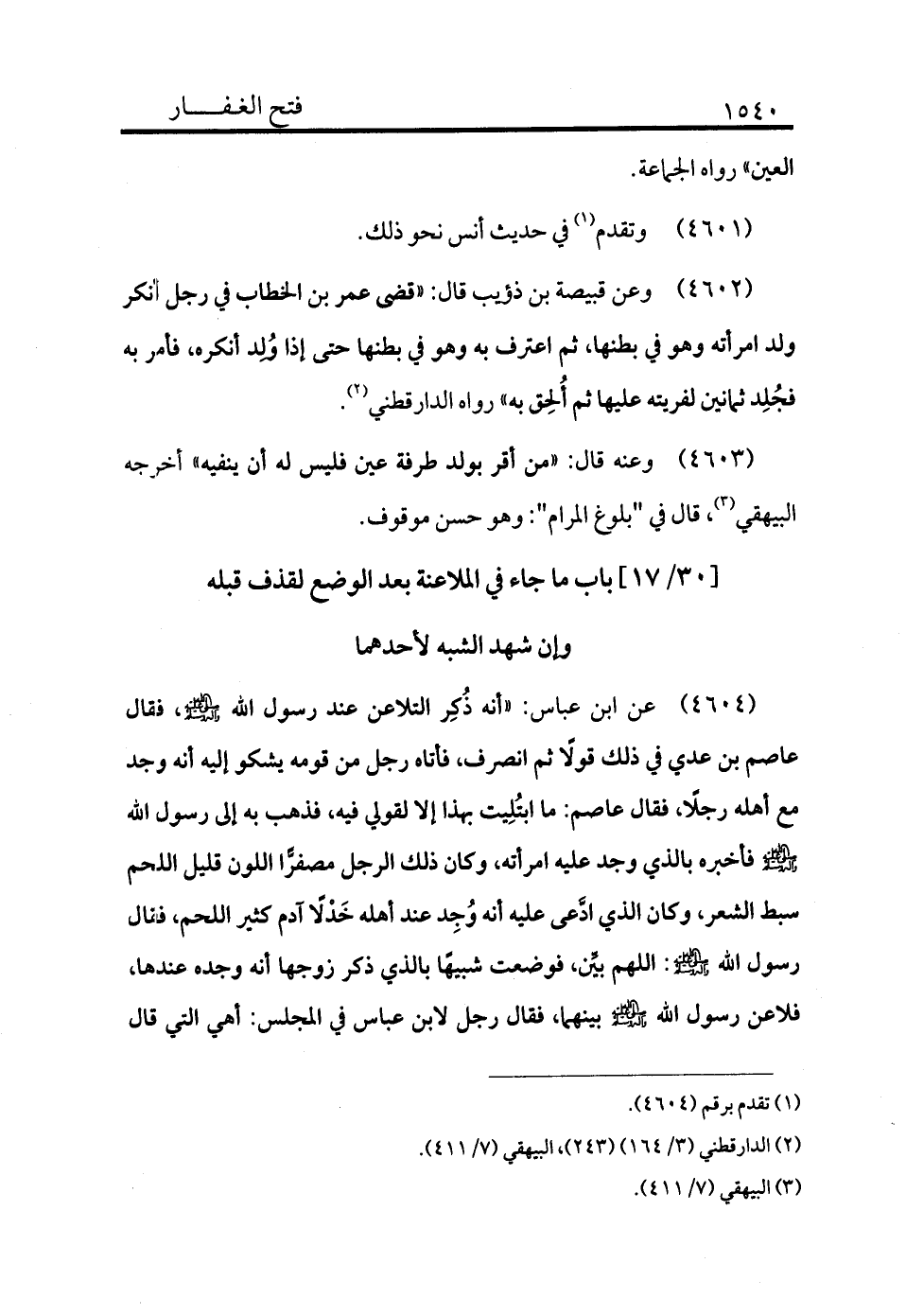 4603 - وعن قبيصة بن ذؤيب قال: «قضى عمر بن الخطاب في رجل أنكر ولد امرأته وهو في بطنها ثم اعترف به وهو في بطنها حتى إذا ولد أنكره فأمر به فجلد ثمانين لفريته عليها ثم ألحق به» رواه الدارقطني (¬2) .