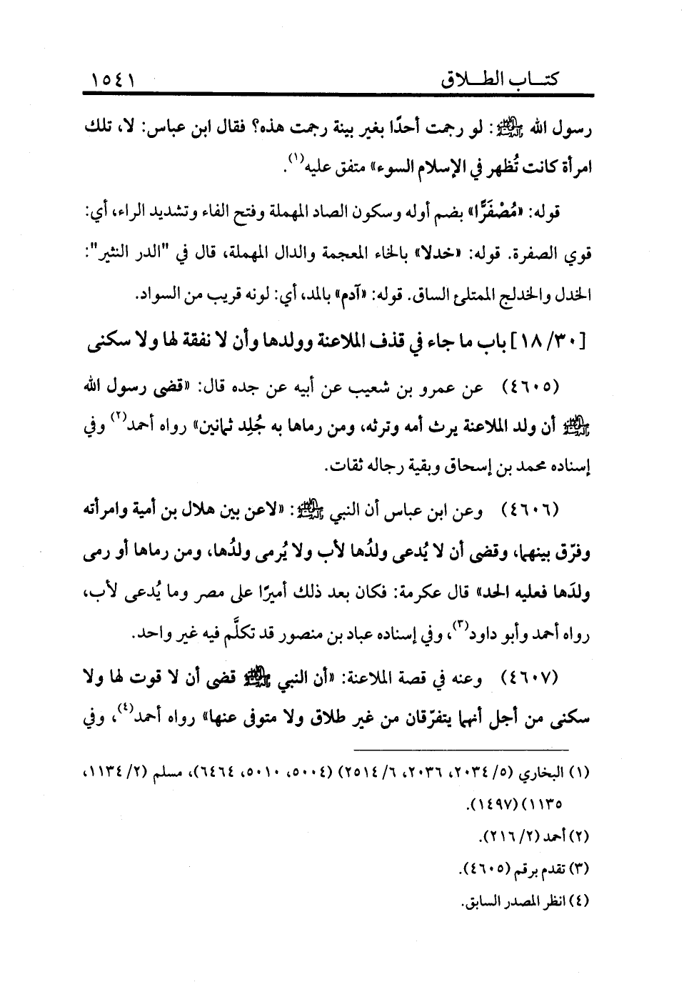 4608 - وعنه في قصة الملاعنة أن النبي - صلى الله عليه وسلم -: «قضى أن لا قوت لها ولا سكنى من أجل أنهما يتفرقان من غير طلاق ولا متوفى عنها» رواه أحمد (¬4) وفي
