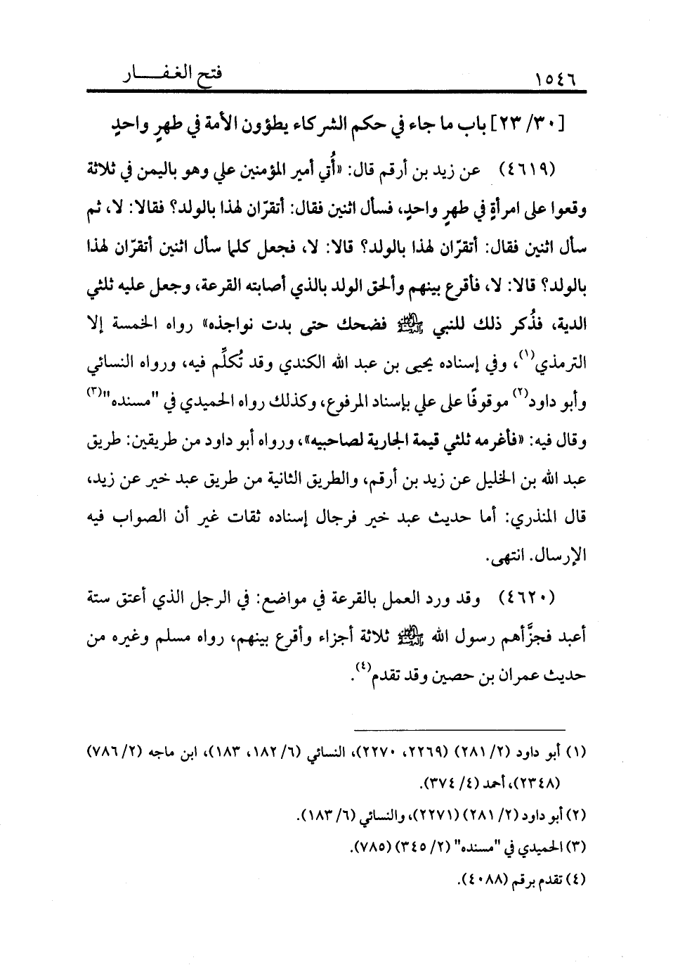 4620 - عن زيد بن أرقم قال: «أُتي أمير المؤمنين علي وهو باليمن في ثلاثة وقعوا على امرأة في طهر واحد فسأل اثنين، فقال: أتقران لهذا بالولد؟ فقالا: لا، ثم سأل اثنين فقال: أتقران لهذا بالولد؟ قالا: لا فجعل كلما سأل اثنين أتقران لهذا بالولد؟ قالا: لا فأقرع بينهم وألحق الولد بالذي أصابته القرعة، وجعل عليه ثلثي الدية، فذكر ذلك للنبي - صلى الله عليه وسلم - فضحك حتى بدت نواجذه» رواه الخمسة إلا الترمذي (¬1) ، وفي إسناده يحيى بن عبد الله الكندي وقد تكلم فيه ورواه النسائي وأبو داود (¬2) موقوفًا على علي بالإسناد المرفوع وكذلك رواه الحميدي في "مسنده" (¬3) ، وقال فيه: «فأغرمه ثلثي قيمة الجارية لصاحبيه» ، ورواه أبو داود من طريقين طريق عبد الله بن الخليل عن زيد بن أرقم والطريق الثانية من طريق عبد خير عن زيد بن أرقم قال المنذري: أما حديث عبد خير فرجال إسناده ثقات غير أن الصواب فيه الإرسال انتهى.