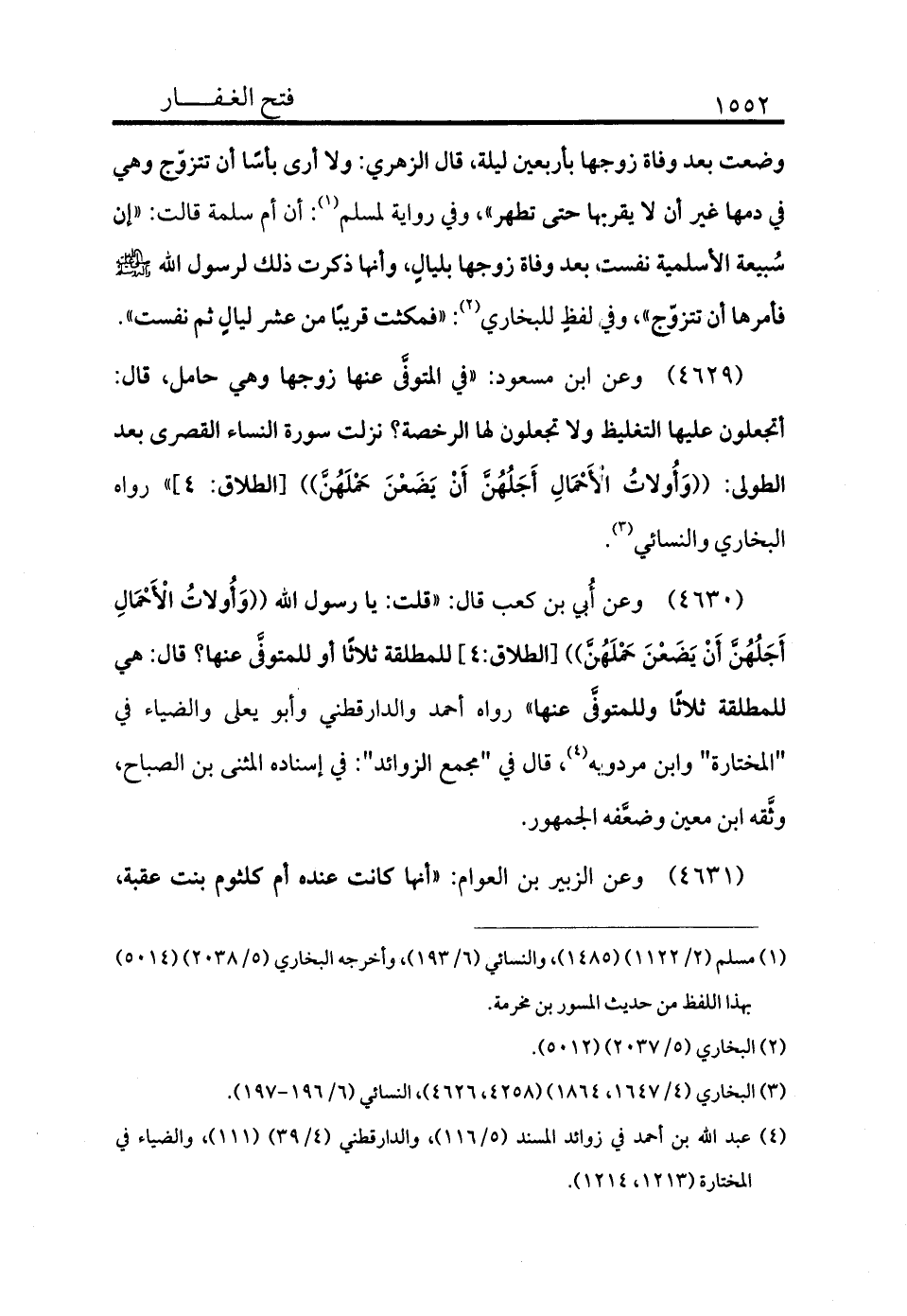 4630 - وعن ابن مسعود «في المتوفى عنها زوجها وهي حامل قال: أتجعلون عليها التغليظ ولا تجعلون لها الرخصة؟ نزلت سورة النساء القصرى بعد الطولى ((وَأُولاتُ الْأَحْمَالِ أَجَلُهُنَّ أَنْ يَضَعْنَ حَمْلَهُنَّ)) [الطلاق: 4] » رواه البخاري والنسائي (¬3) .