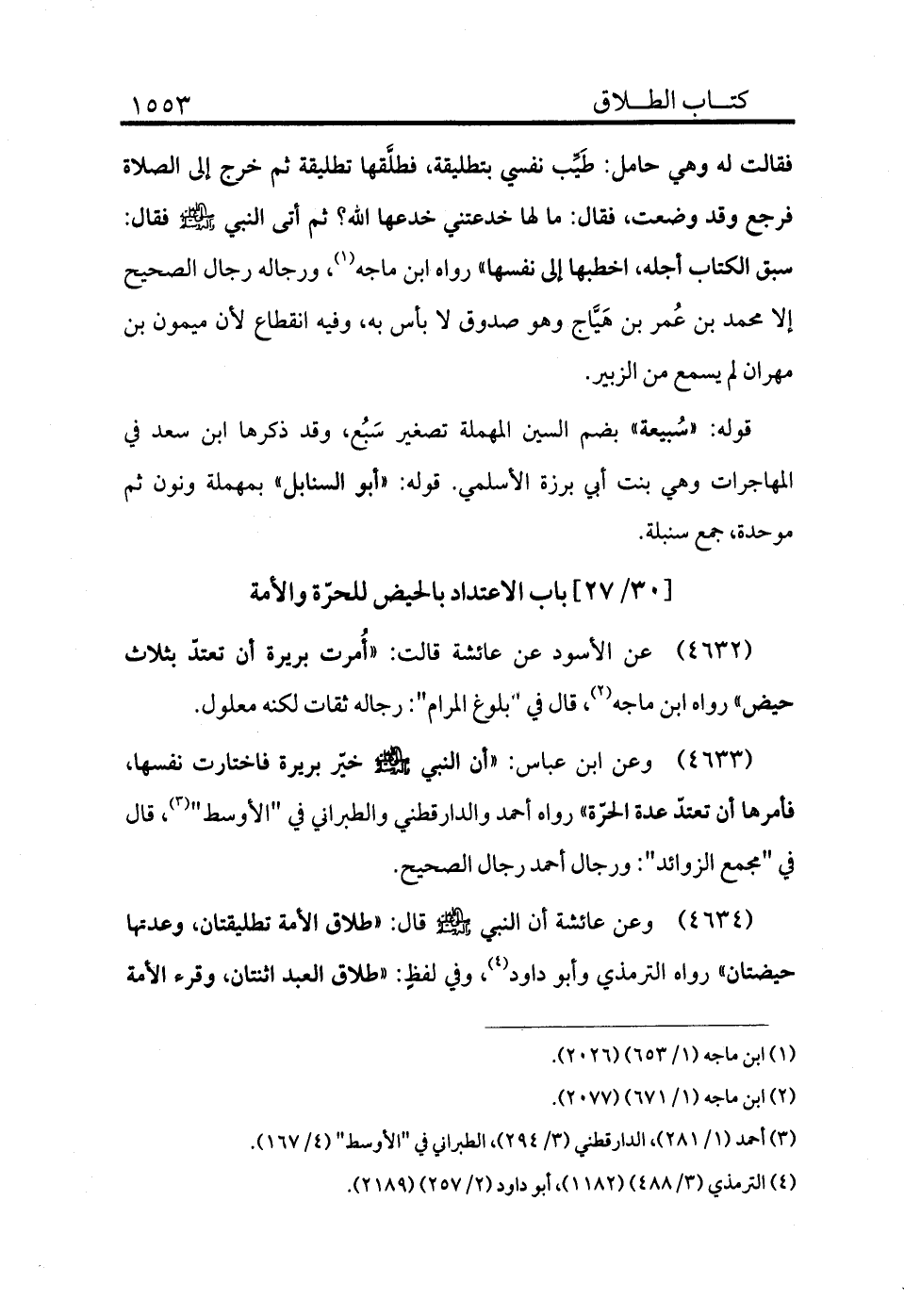 4633 - عن الأسود عن عائشة قالت: «أُمرت بريرة أن تعتد بثلاث حيض» رواه ابن ماجة (¬2) قال في "بلوغ المرام": رجاله ثقات لكنه معلول.