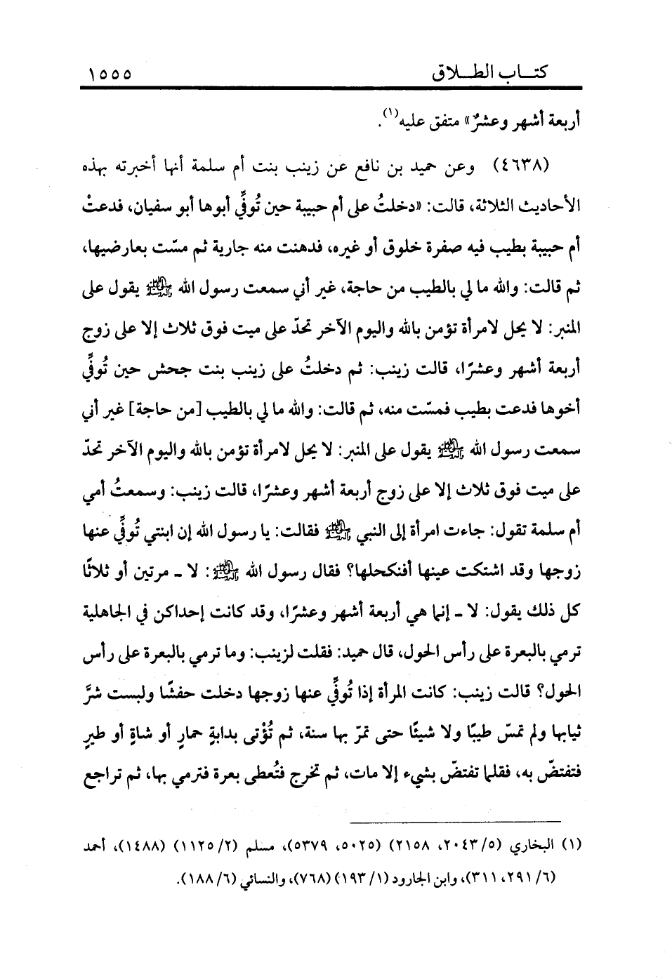 4639 - وعن حميد عن نافع عن زينب بنت أم سلمة «أنها أخبرته بهذه الأحاديث الثلاثة قالت: دخلت عليَّ أم حبيبة حين توفي أبوها أبو سفيان فدعت أم حبيبة بطيب فيه صفرة خلوق أو غيره فدهنت منه جارية ثم مست بعارضيها ثم قالت: والله ما لي بالطيب من حاجة غير أني سمعت رسول الله - صلى الله عليه وسلم - يقول على المنبر: لا يحل لامرأة تؤمن بالله واليوم الآخر تحد على ميت فوق ثلاث إلا على زوج أربعة أشهر وعشرًا قالت زينب: ثم دخلت عليَّ زينب بنت جحش حين توفي أبوها فدعت بطيب فمست منه ثم قالت: والله ما لي بالطيب من حاجة غير أني سمعت رسول الله - صلى الله عليه وسلم - يقول على المنبر: لا يحل لامرأة تؤمن بالله واليوم الآخر تحد على ميت فوق ثلاث إلا على زوج أربعة أشهر وعشرًا قالت زينب: وسمعت أمي أم سلمة تقول: جاءت امرأة إلى النبي - صلى الله عليه وسلم - فقالت: يا رسول الله إن ابنتي توفى عنها زوجها وقد اشتكت عينها أفنكحلها، فقال رسول الله - صلى الله عليه وسلم -: لا مرتين أو ثلاثًا كل ذلك يقول: لا إنما هي أربعة أشهر وعشرًا وقد كانت إحداكن في الجاهلية ترمي بالبعرة على رأس الحول قال حميد: فقلت لزينب وما ترمي بالبعرة على رأس الحول قالت زينب: كانت المرأة إذا توفي عنها زوجها دخلت حشًا ولبست شر ثيابها ولم تمس طيبًا ولا شيئًا حتى تمر بها سنة ثم تؤتى بدابة حمار أو شاة أو طير فتنتفض به، فقلما تنتفض بشيء إلا مات، ثم تخرج فتعطى بعرة فترمي بها، ثم تراجع