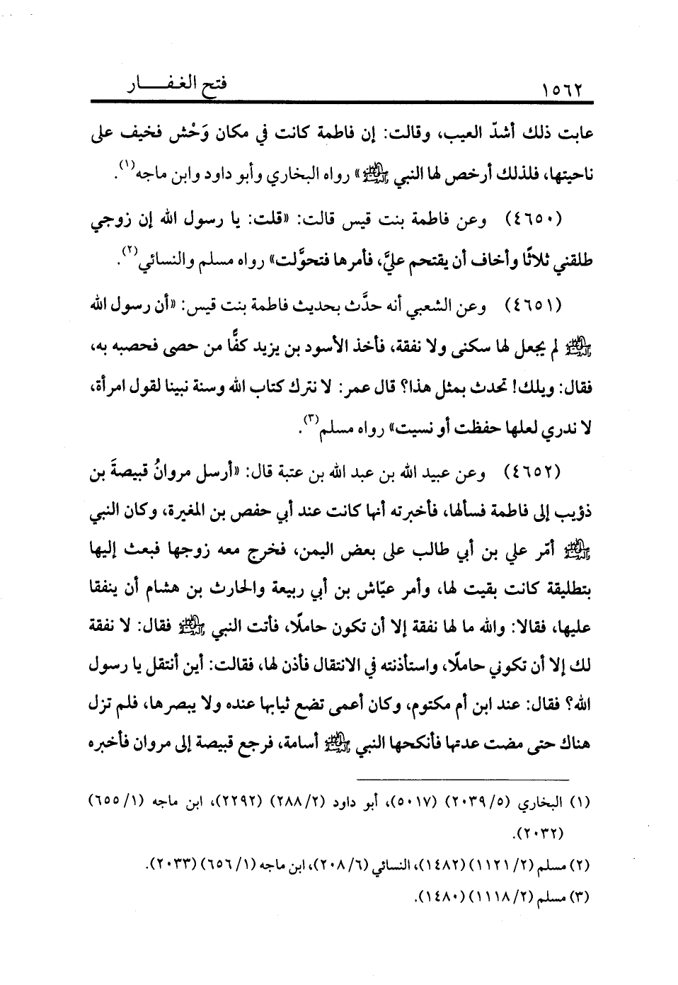 4651 - وعن فاطمة بنت قيس قالت: «قلت يا رسول الله إن زوجي طلقني ثلاثًا وأخاف أن يقتحم عليَّ فأمرها فتحولت» رواه مسلم والنسائي (¬2) .