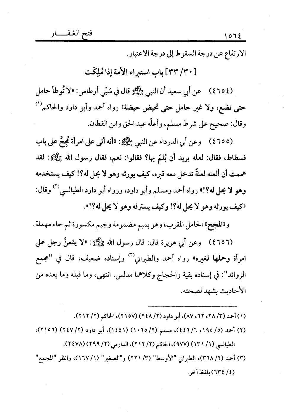 4655 - عن أبي سعيد أن النبي - صلى الله عليه وسلم - قال في سبي أوطاس: «لا توطأ حامل حتى تضع ولا غير حامل حتى تحيض حيضة» رواه أحمد وأبو داود والحاكم (¬1) وقال صحيح على شرط مسلم وأعله عبد الحق وابن القطان.