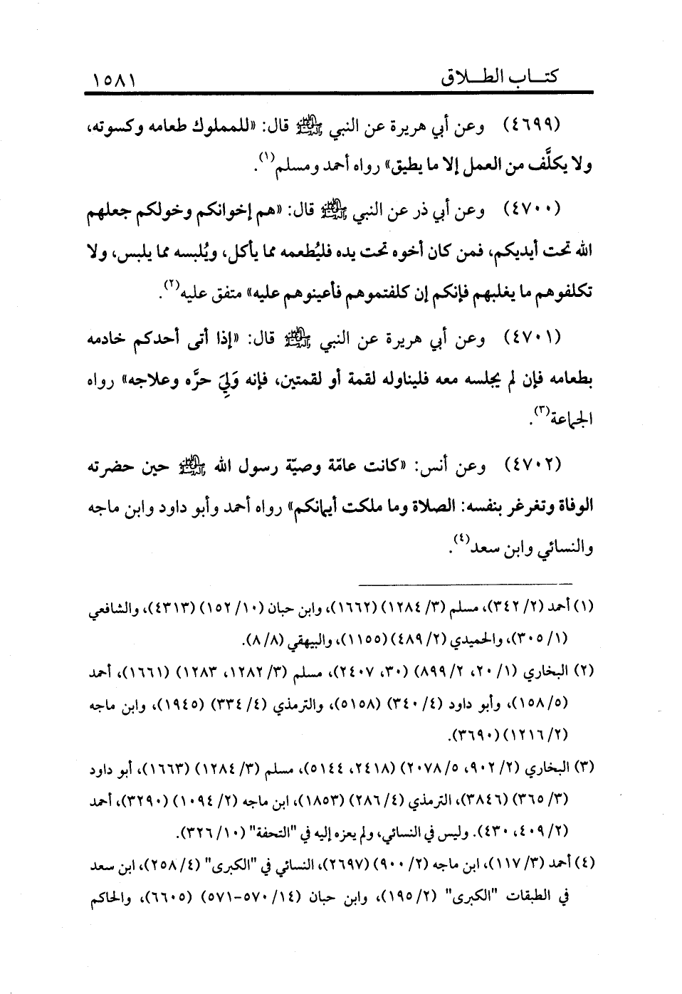 4700 - وعن أبي هريرة عن النبي - صلى الله عليه وسلم - قال: «للمملوك طعامه وكسوته ولا يكلف من العمل إلا ما يطيق» رواه أحمد ومسلم (¬1) .