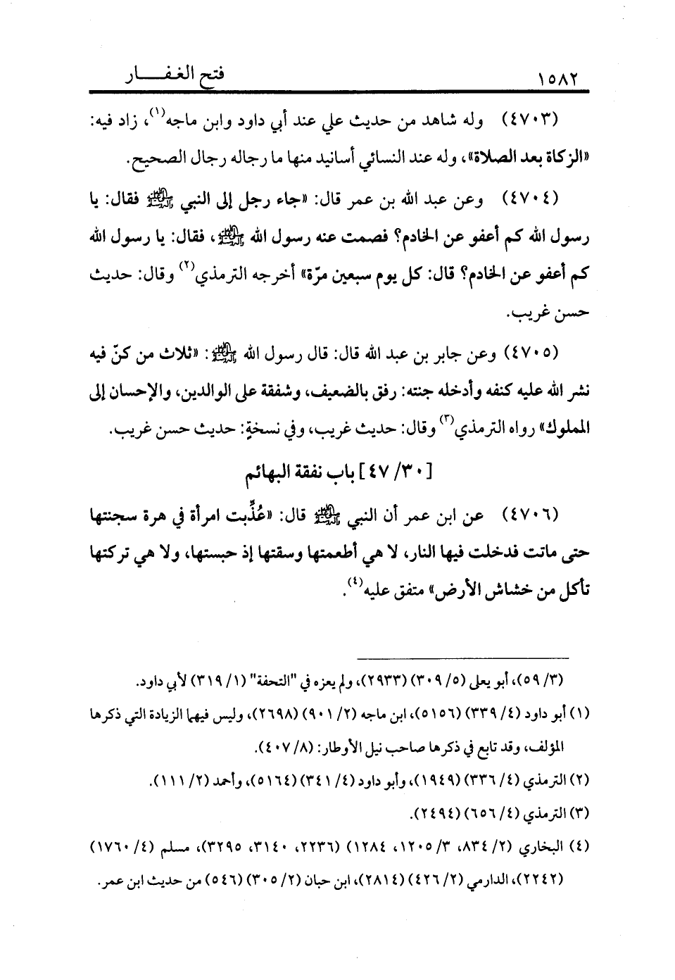 4707 - عن ابن عمر أن النبي - صلى الله عليه وسلم - قال: «عذبت امرأة في هرة سجنتها حتى ماتت فدخلت فيها النار لا هي أطعمتها وسقتها إذ حبستها ولا هي تركتها تأكل من خشاش الأرض» متفق عليه (¬4) .