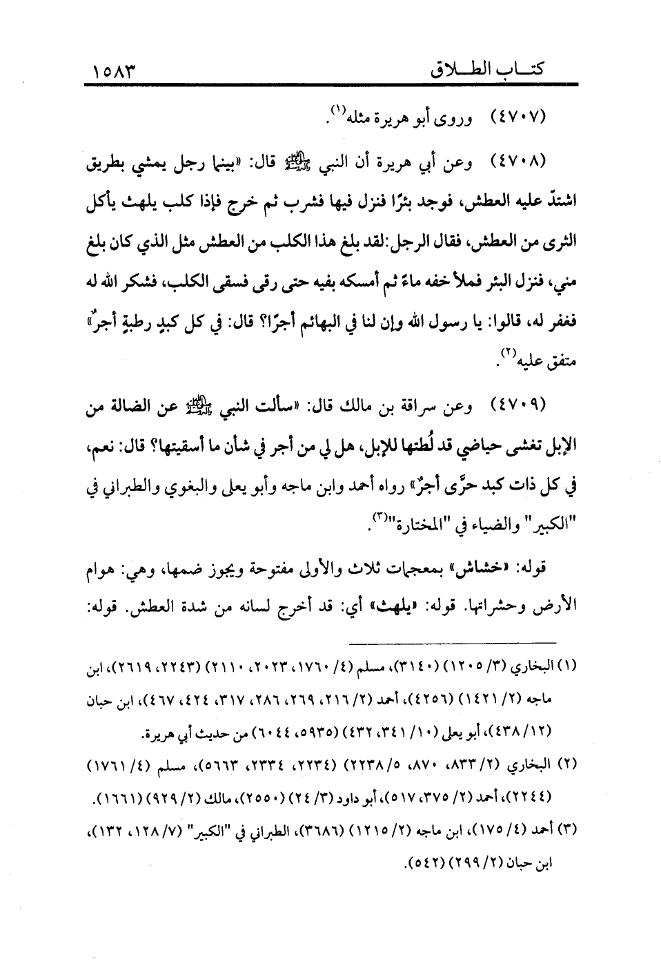 4710 - وعن سراقة بن مالك قال «سألت النبي - صلى الله عليه وسلم - عن الضالة من الإبل تغشى حياضي قد لطتها للإبل هل لي من أجر في شأن ما أسقيتها؟ قال: نعم، في كل ذات كبد حراء أجرًا» رواه أحمد وابن ماجة وأبو يعلى والبغوي والطبراني في "الكبير" والضياء في "المختارة" (¬3) .