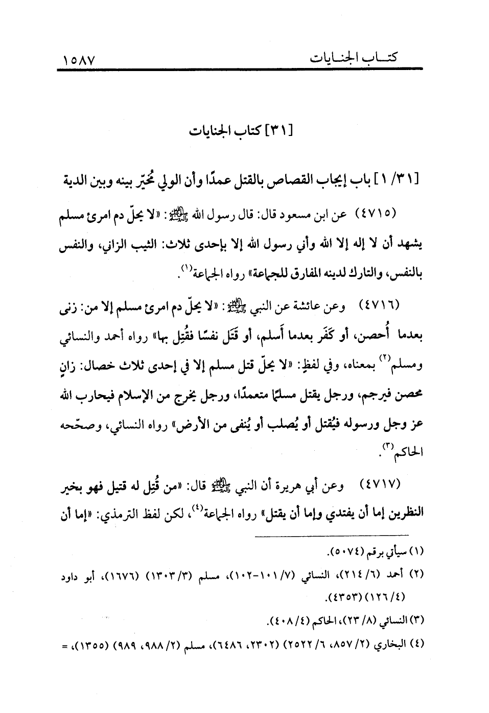 4716 - عن ابن مسعود قال: قال رسول الله - صلى الله عليه وسلم -: «لا يحل دم امرئ مسلم يشهد أن لا إله إلا الله وأني رسول الله إلا بإحدى ثلاث الثيب الزاني والنفس بالنفس والتارك لدينه المفارق للجماعة» رواه الجماعة (¬1) .