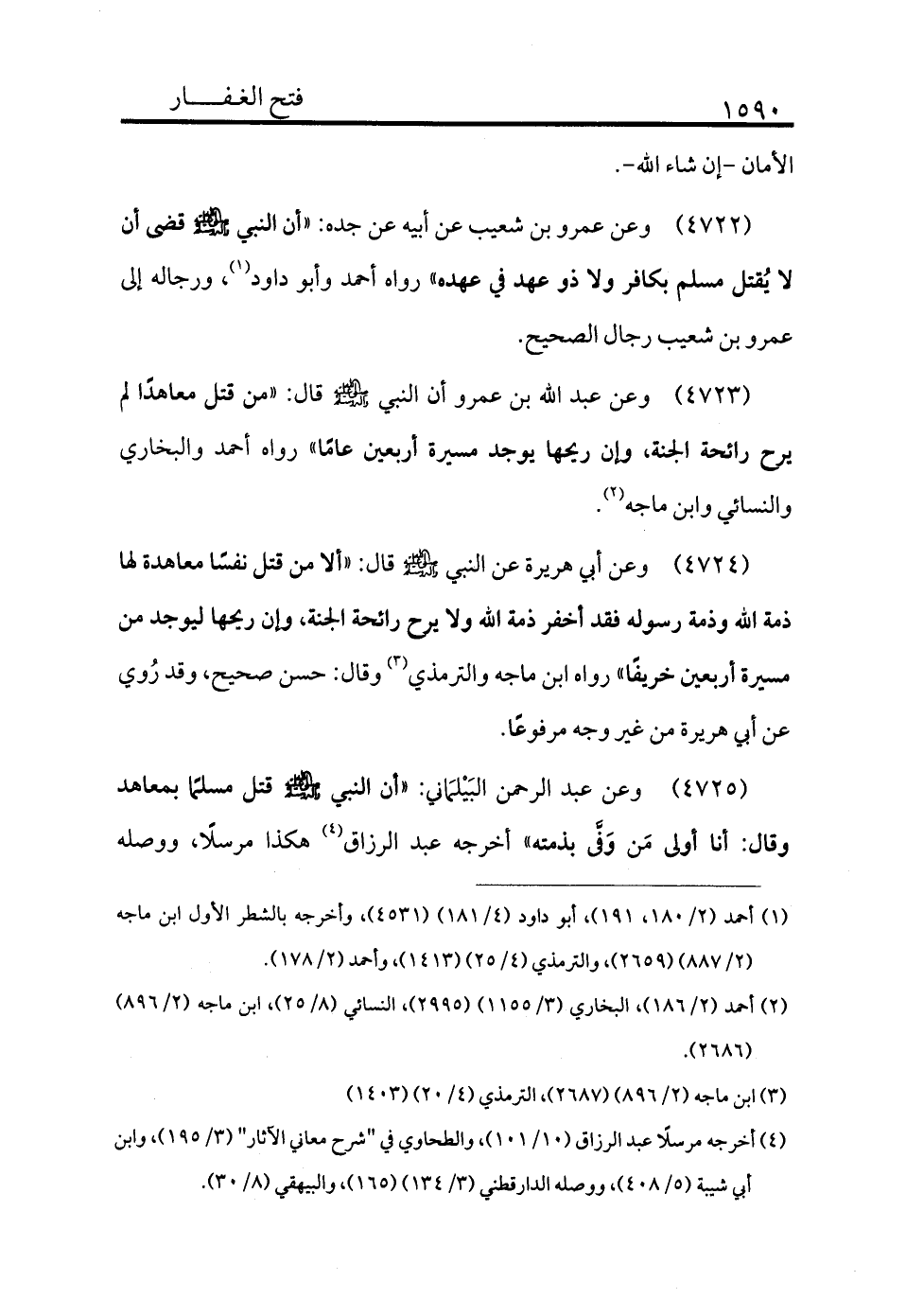 4724 - وعن عبد الله بن عمرو أن النبي - صلى الله عليه وسلم - قال: «من قتل معاهدًا لم يرح رائحة الجنة وإن ريحها يوجد مسيرة أربعين عامًا» رواه أحمد والبخاري والنسائي وابن ماجة (¬2) .