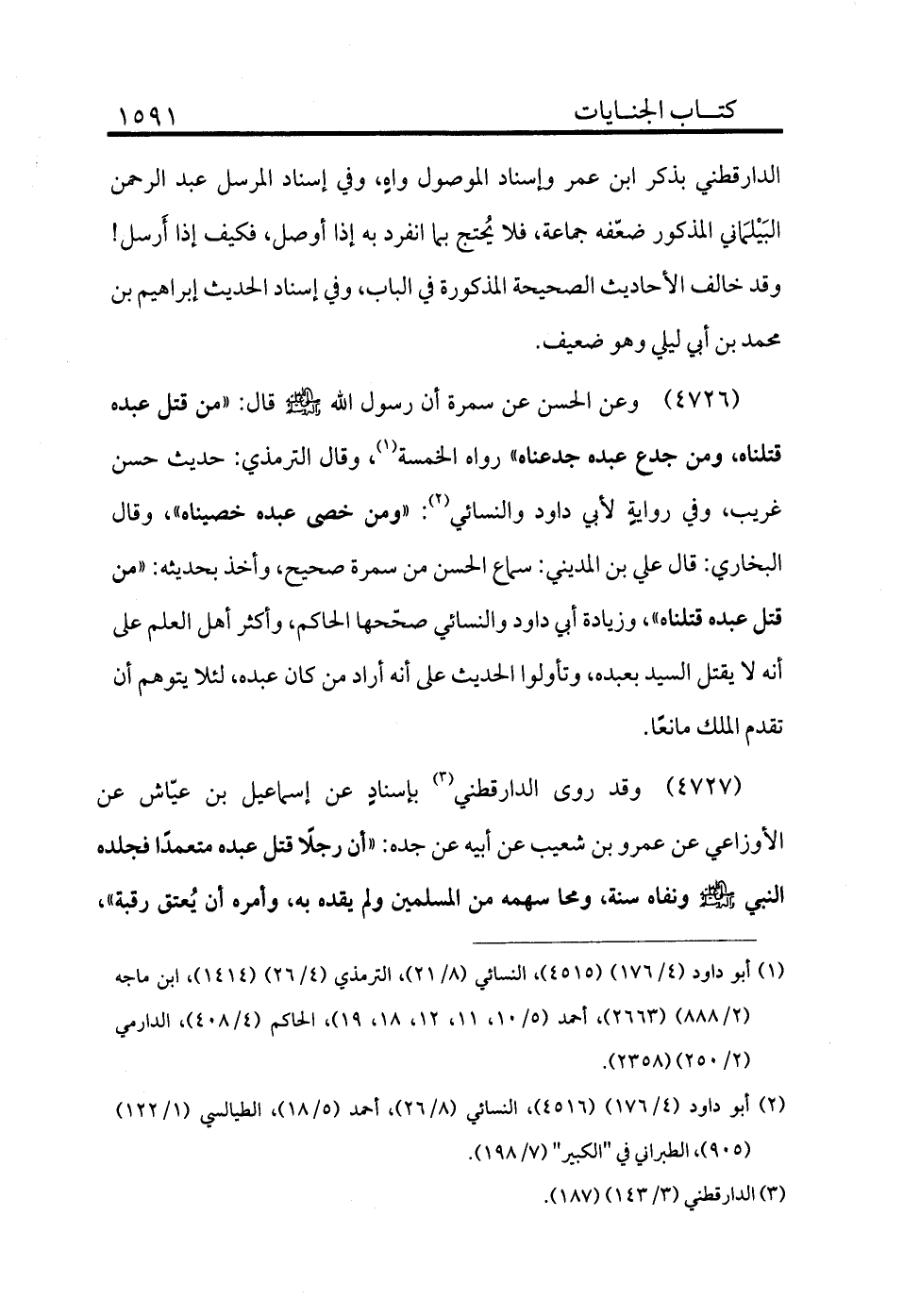 4727 - وعن الحسن عن سمرة أن رسول الله - صلى الله عليه وسلم - قال: «من قتل عبده قتلناه، ومن جدع عبده جدعناه» رواه الخمسة (¬1) ، وقال الترمذي: حديث حسن غريب، وفي رواية لأبي داود والنسائي (¬2) : «ومن خصا عبده خصيناه» وقال البخاري: قال علي بن المديني: سماع الحسن من سمرة صحيح، وأخذ بحديثه «من قتل عبده قتلناه» وزيادة أبي داود والنسائي صححها الحاكم، وأكثر أهل العلم على أنه لا يقتل السيد بعبده، وتأولوا الحديث على أنه أراد من كان عبده لئلا يتوهم أن تقدم الملك نافعًا.