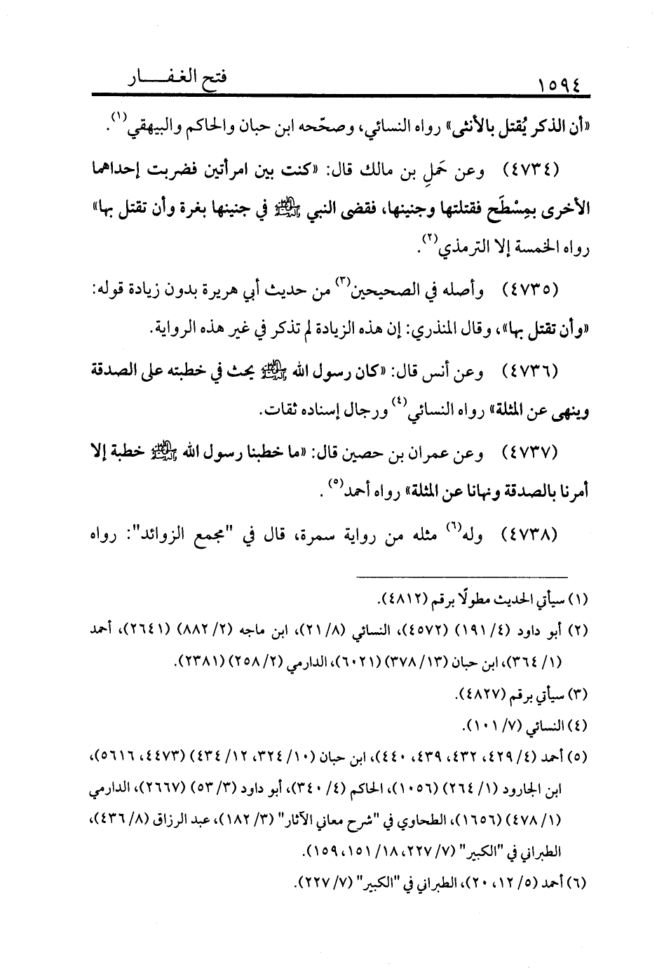 4737 - وعن أنس قال: «كان رسول الله - صلى الله عليه وسلم - يحث في خطبته على الصدقة وينهى عن المثلة» رواه النسائي (¬4) ورجال إسناده ثقات.